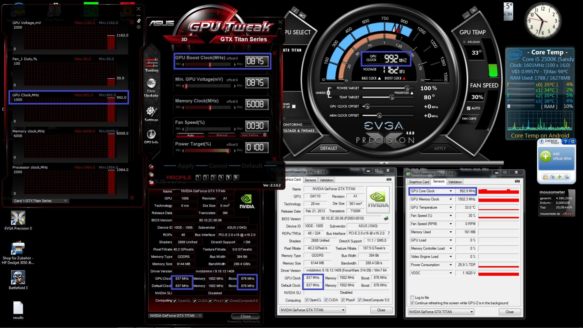 Der Speicher lässt sich komplett in einzelnen MHz-Schritten takten, hier scheinen die Reserven aber begrenzt zu sein, besonders wenn man die GPU schon weit hochgetaktet hat, da sich GPU und Speicher das gleiche Power Target (max. 265W bei 106% teilen) und Speicher OC recht viel Energie benötigt. Mein Speicher macht gerade mal +50 MHz mit bei +156 MHz GPU. Das sah bei der 680 noch besser aus, da kam ich auf über +500, wobei ich dort auch 130% PT hatte. Aber bei der gigantischen Speicherbandbreite der Titan ist der GPU Takt deutlich interessanter als der Speichertakt meiner Meinung nach.