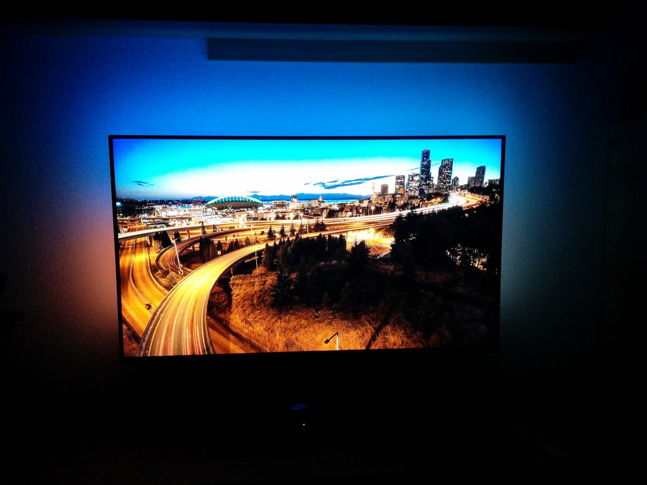 Grad im oberen Bereich und den oberen Ecken leuchtet das dreiseitige Ambilight finde ich voluminöser, unten ist es ähnlich wie bei dir.