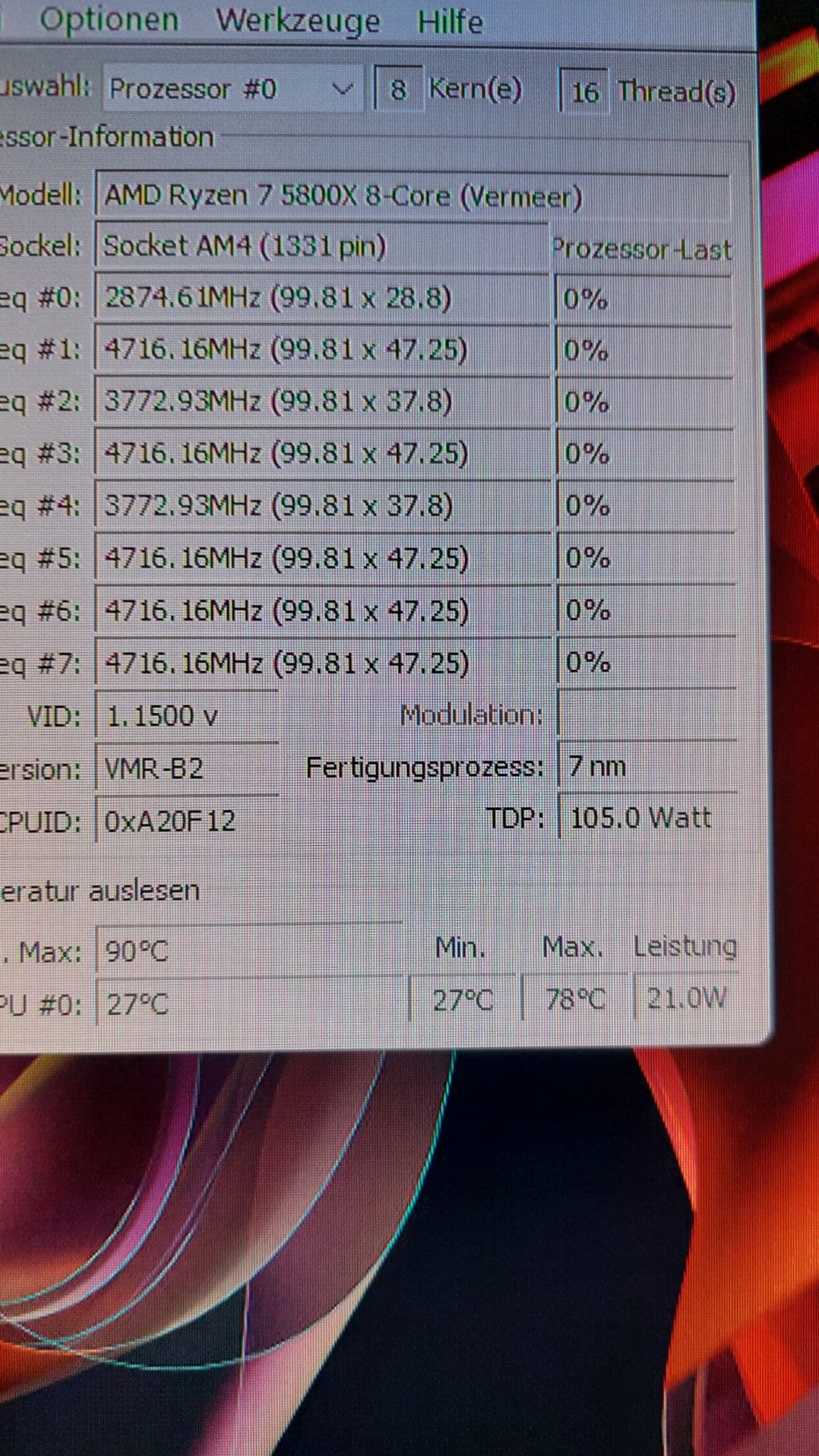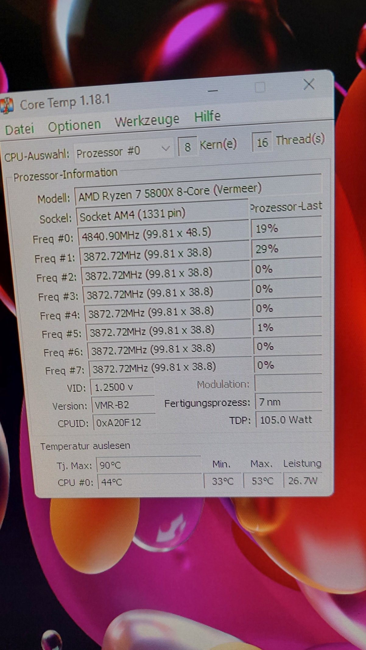 Temperatur im Idle mit dem 5800X bei 22 Grad Raumtemp bei 27-30 Grad.