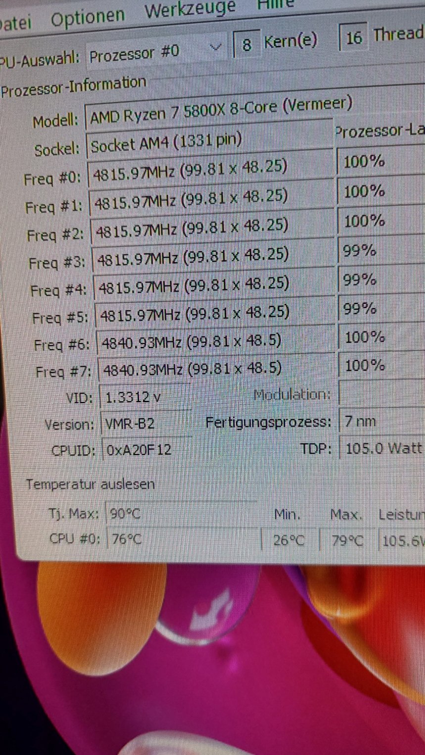 CPU undervoltet mit -25 und hat im Cinebench 23 max 78 Grad und läuft fast durchgehend auf 4741Mhz.