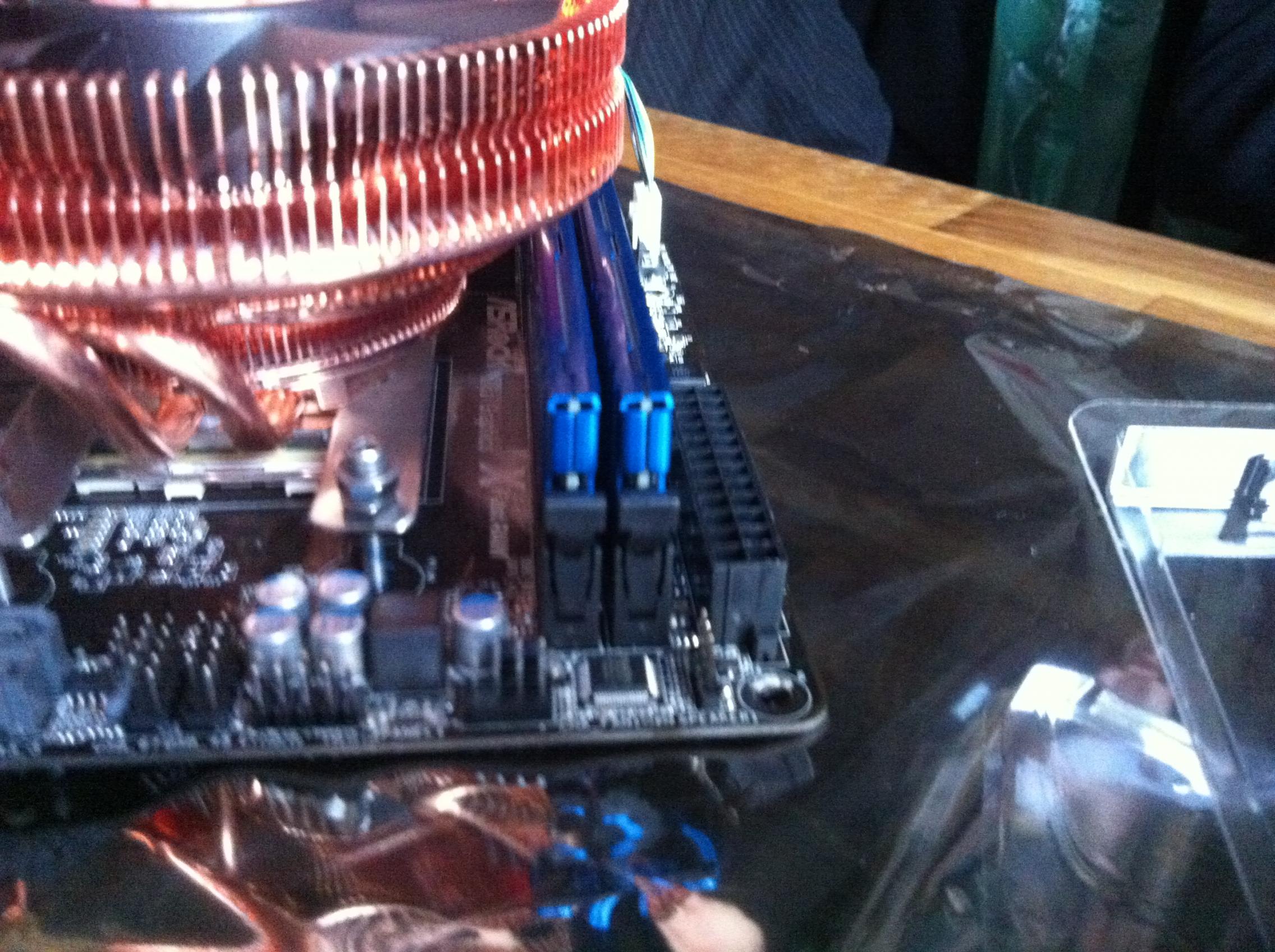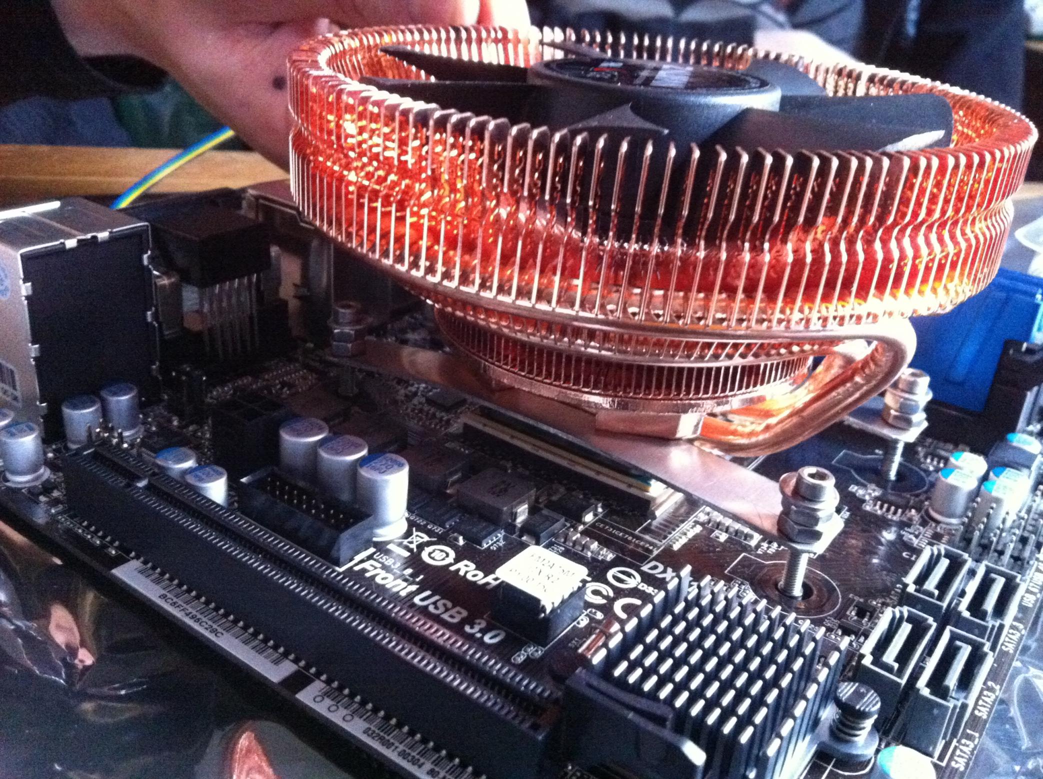 Die erste größere Enttäuschung war der CPU-Kühler, der leider nur so aufgesetzt werden konnte, dass die Heatpipes die RAM-Slots blockieren. Die Halterungsbohrungen des FM2 bilden ja ein Rechteck, sodass man den Kühler nur um 180°, nicht in 90°-Intervallen wie bei Intel drehen kann. Da wir aber zufällig einen Maschinenbauer dabei hatten, hat der neue Halteklammern gemacht die uns dann doch noch die Nutzung ermöglichten.