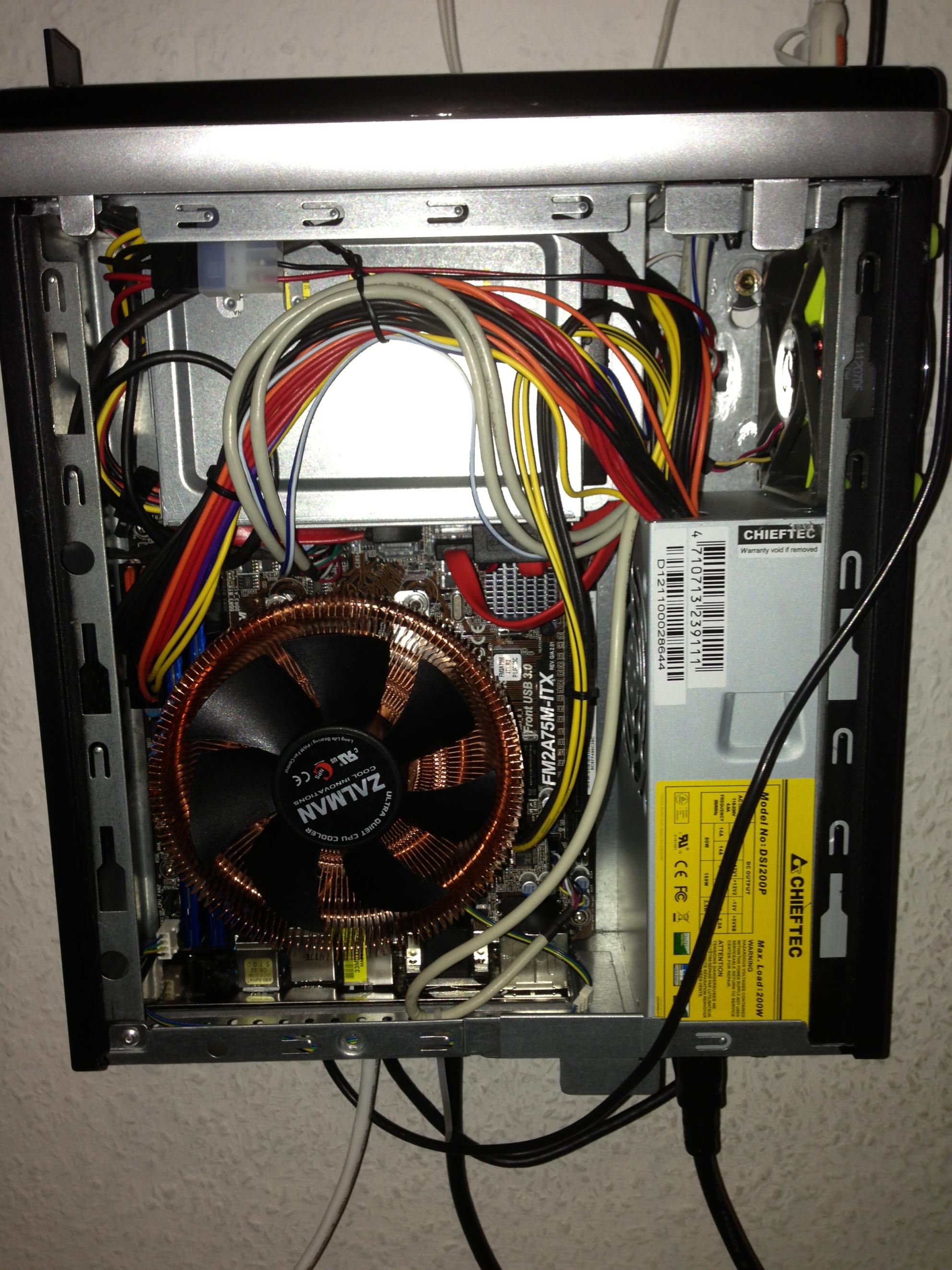 Beim Case sind wir vom Vorschlag des Artikels abgewichen da das FI-01 keinen Cardreader hat und kaum weniger kostet als das FI-02. Als ich das Case dann endlich in der Hand hatte sind mir zwei kleine Kritikpunkte aufgefallen. Erstens ist es ein bisschen verwindbar (ich hatte mit einer höheren Steifigkeit gerechnet) und zweitens wird das NT mit etwas Abstand zum Boden (der schmalen Seite, nicht der Ebene in der das Mainboard liegt) gehalten, sodass es am verschraubungsfernen Ende etwas bewegt werden kann. Das ist aber natürlich meckern auf hohen Niveau, ansich ist das Case voll in Ordnung (insbesondere wenn man daran denkt, dass es nur ~50€ inklusive NT kostet).