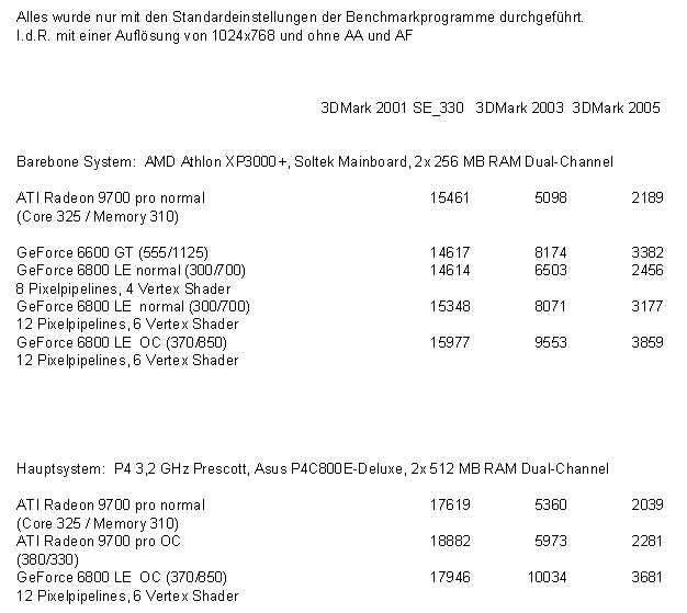 Ich habe die Karten in 2 unterschiedlichen Systemen mit den 3 Benchmark Programmen von Futuremark 3DMark 01/03/05 durchgeführt. Die Ergebnisse könnt Ihr Euch im angehangenen Bild anschauen.