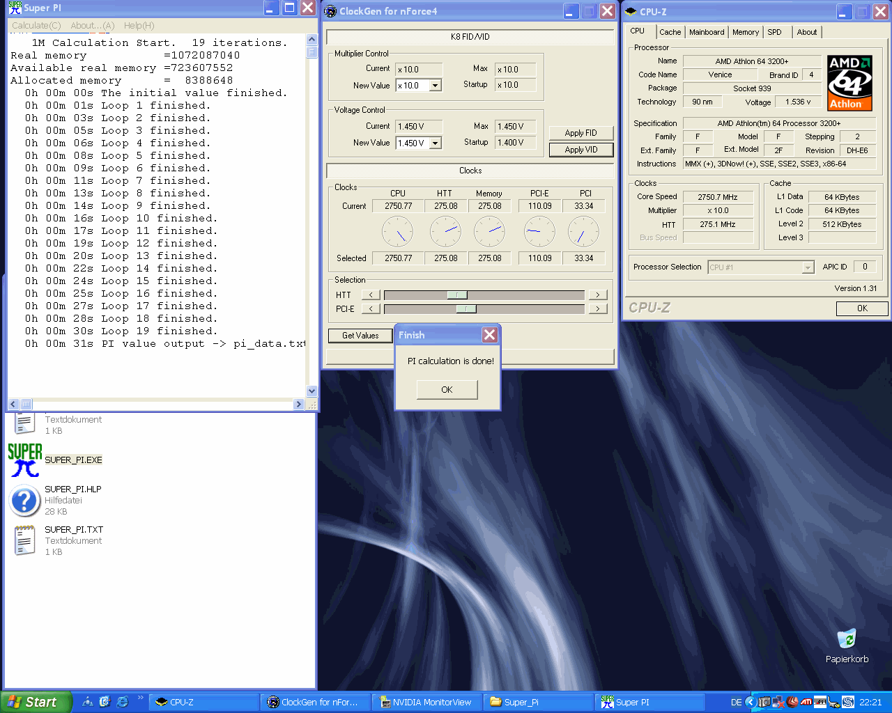 Hallo, also die v core werte von glock gen sind nicht ganz richtig aber dafür sind die von cpuz wesentlich korrekter, die speicher laufen mit 2,5-3-6-3 leider kriege ich die speicher timings nicht schärfer, (habe schon sämtliche einstellungen probiert) aber wenn jemand ideen oder anregungen zu den speicher timings hat nur her damit testen kostet ja nichts und da die speicher sowieso lebenslange garantie haben ist es eh egal, hier noch mal super pi...