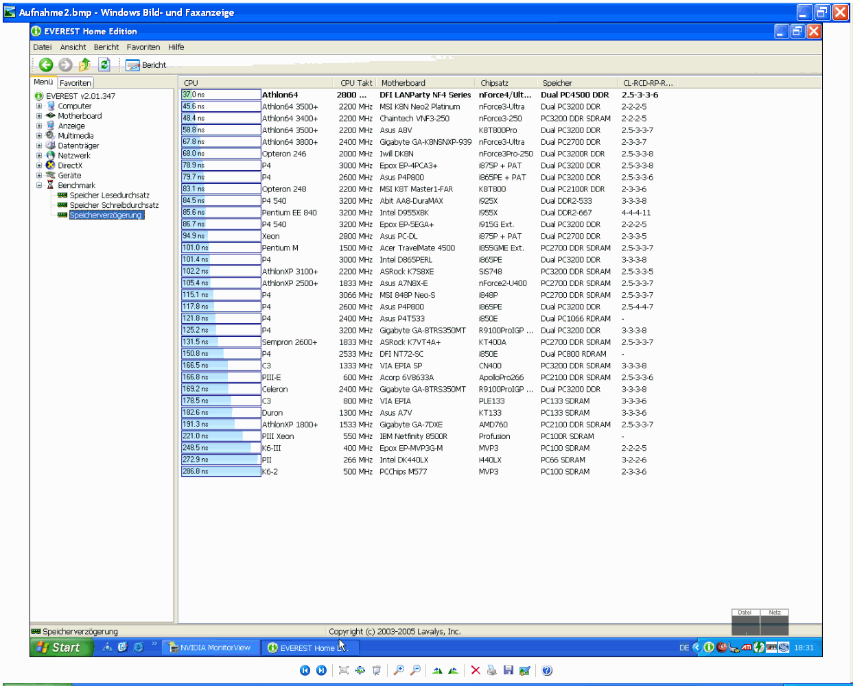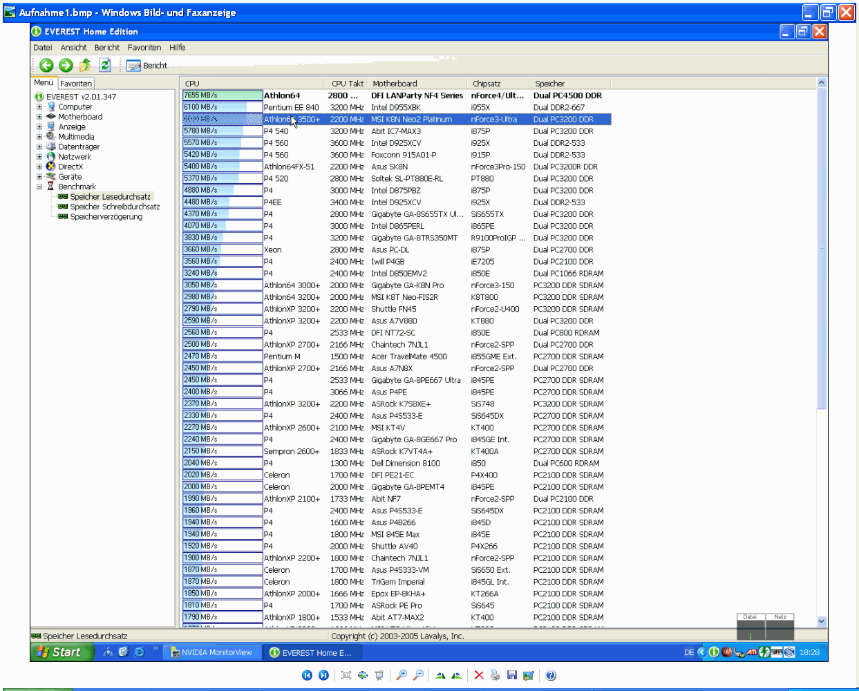Hallo, also mein opteron 146 war voll der grif daneben bei mir lief das mist ding nicht mal auf 2800mhz stabil obwohl ich super speicher hatte (OCZ Technology DIMM Kit 1024MB PC4800 DDR CL2.5-3-3-6-2T Platinum (PC600), wie gesagt ich hab den opteron wieder zurück geschickt und mir nen athlon64 3200+ (venice kern- e6 stepping) geholt und ich muß sagen das der 3200+ viel mehr leistung bring (zumindest bei meinem rechner) zu dem opteron kann ich nur sagen das ich bestimmt einen ausselektierten mist ding bekommen hatte...aber egal der ich bin absulut zufrieden mit meinem athlon hier mal einige benchmark ergebnisse vom everest... weitere werden folgen wenn ich die timings von den speichern noch ein wenig schärfer kriege muß noch ein paar tests laufen lassen...