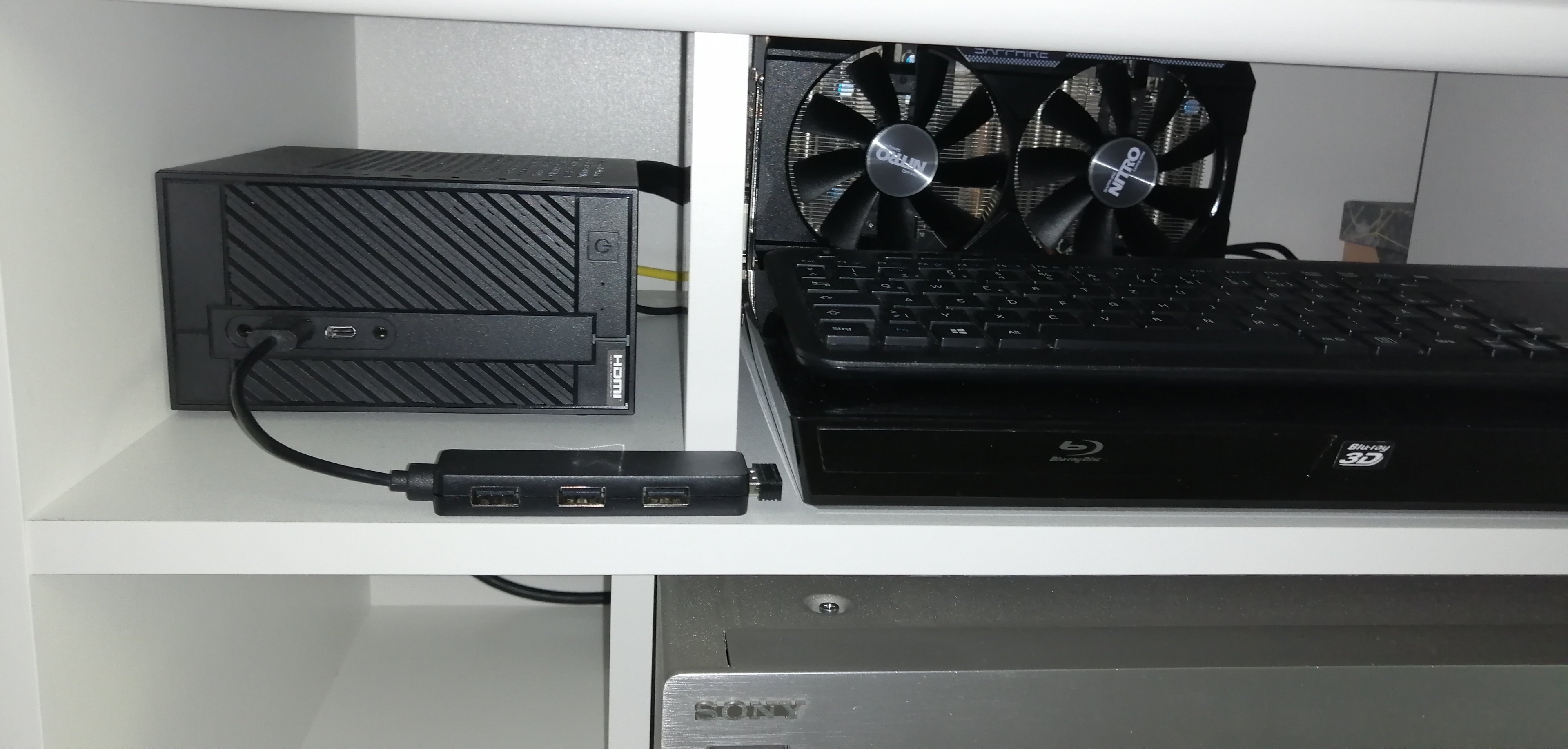 Werte Bastelwütige, ich wollte euch heute auch Mal ein Update zur externen Graka am A300 geben. Nachdem der ADT Adapter, wie schon erwähnt, lange auf sich warten lassen hat, habe ich alles zusammen gebaut und es lief. Mit einer Powercolor HD7850 aber nur zufriedenstellend. 2GB VRam sind halt wenig. Also Kleinanzeigen über Tage durchwühlt und vor ein paar Tagen fündig geworden. Nun steckt eine Sapphire R9 380 4Gb im Adapter. Wer sich jetzt fragt warum so eine "alte" Karte, nun sie kam 2015 raus, was wichtig war wegen der Unterstützung und sie kam nur 50€. Top Zustand. Lediglich die WLP müsste ich erneuern. Also nicht das neueste Modell, dafür aber leise und genügend Leistung um FH4 in FHD auf meinen 65" zu zocken. Diese gibt auch endlich Sound über HDMi aus, was die HD7850 nicht für nötig hielt. Lag eventuell am nicht vorhandenen TrueAudio🤔. Oder am Alter der GPU. Wie dem auch sei ich bin äußerst zufrieden. Die GPU hängt über den ADT Adapter an ein Seasonic 380 Watt Netzteil. Den Sound hole ich mir trotzdem seperat über eine USB Soundkarte Soundblaster X-fi von Creative um alles in 5.1 über meine Heimkinoanlage zu genießen.