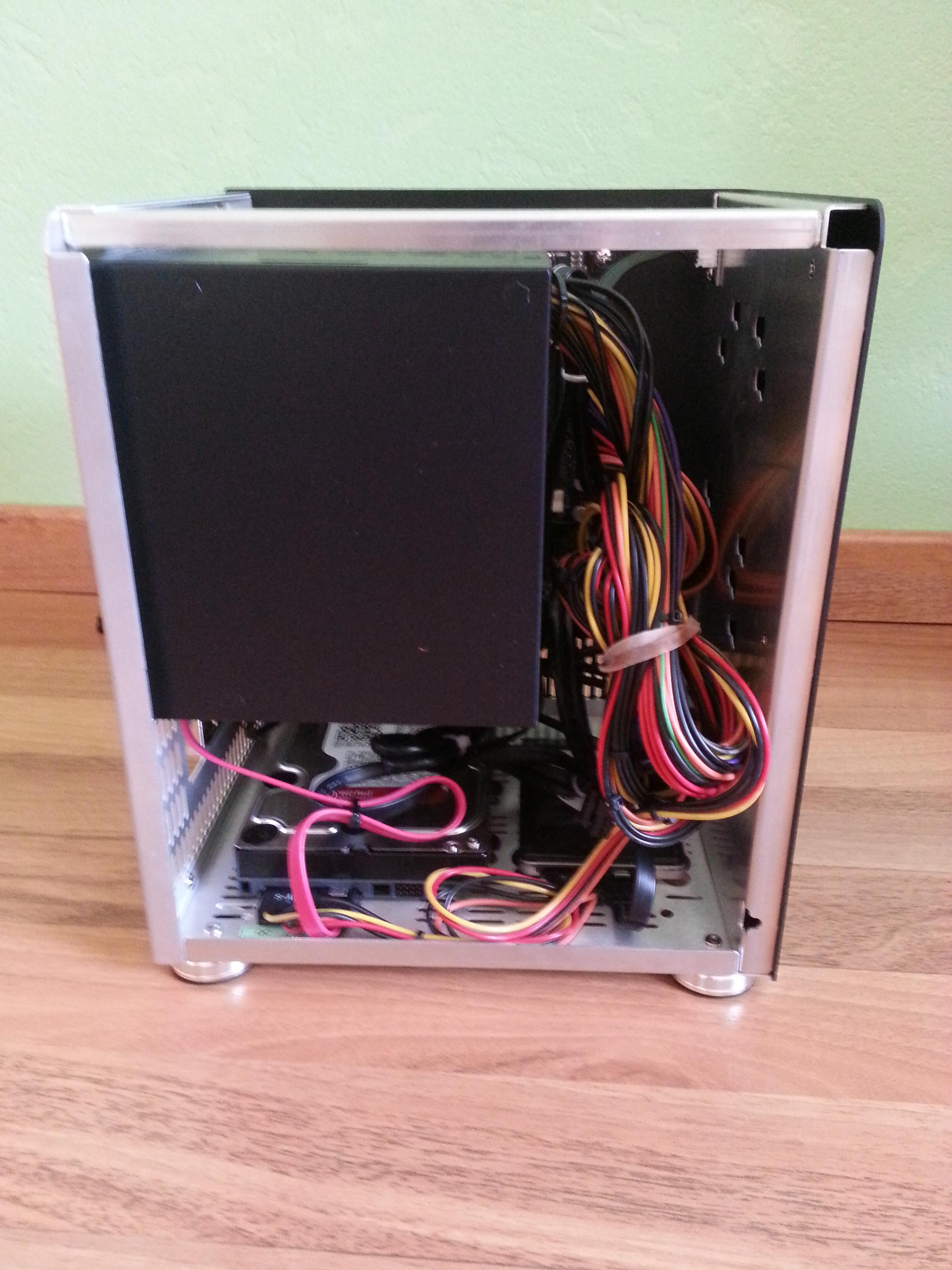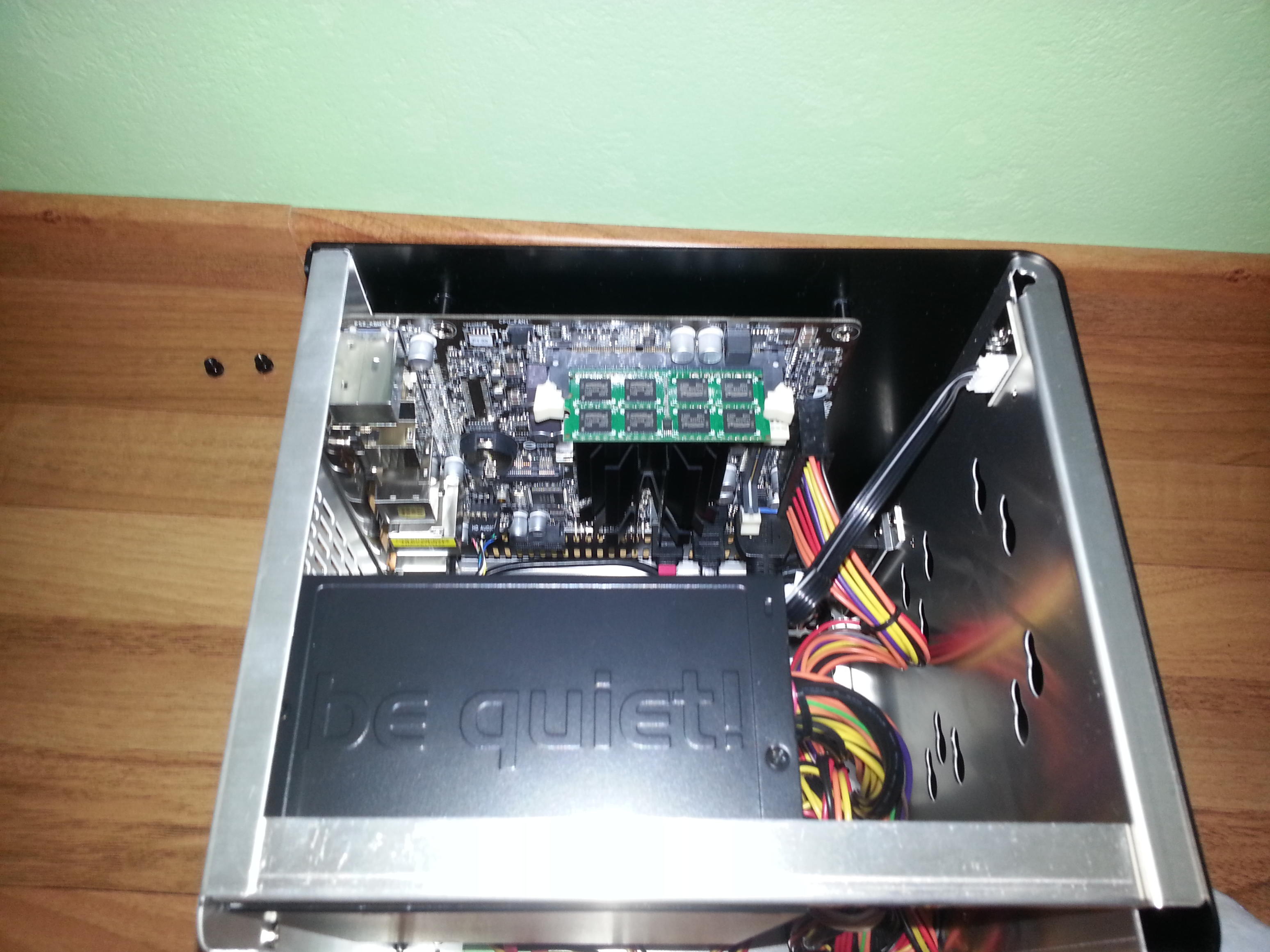Es war das erste Mal, dass ich einen PC komplett zusammengebaut habe und nicht nur Teile austauschte. Nachdem ich alle Teile ausgepackt habe, fing ich an alles zusammenzubauen. Das große ATX-Netzteil in ein Mini ITX Gehäuse zu montieren war etwas frickelig, klappte aber zum Schluss. Die SSD und HDD wurden am Boden des Gehäuses mit Schrauben und "Vibrationsschutzgummis" eingeschoben. Auf einen Lüfter wurde verzichtet. Dieser wird bisher nicht benötigt. Das Mainboard mit dem Abdeckbleck zu montieren verlief ebenfalls schnell und problemlos. Bei allen Teilen wurden verständliche Anleitungen mitgeliefet. Man konnte eigentlich gar nichts falsch machen. Im großen und ganzen verlief alles sehr einfach. Nach ca. 45 Minuten war alles zusammengebaut und ich konnte den Server in Betrieb nehmen.