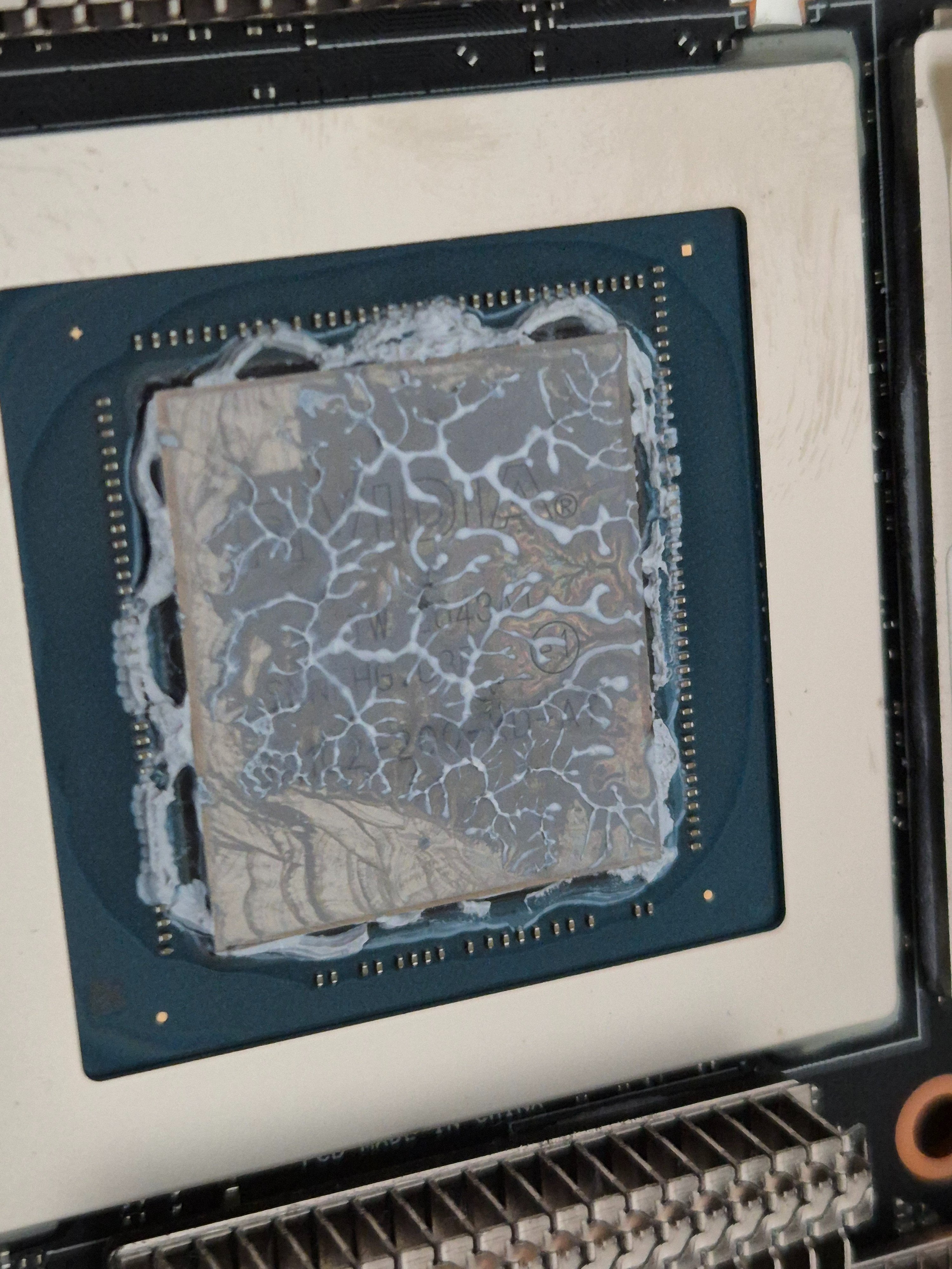 Nachdem alles aufgetragen war, habe ich kontrolliert, ob überall Kontakt besteht: Also Kühler ohne WLP wieder drauf, kurz angedrückt, dann wieder abgenommen und den Abdruck überprüft.