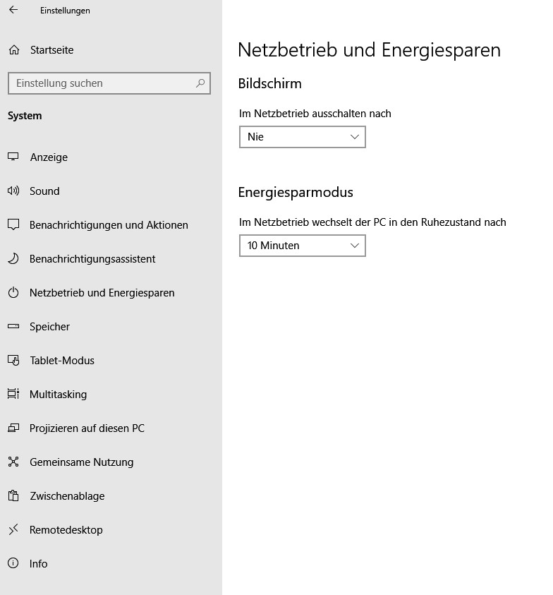 Es gibt unter Netzbetrieb und Energiesparen vier Optionen : Bildschirm ausschalten (Netzmodus/Akkumodus) und Energiesparmodus (Netzmodus/Akkumodus). Letzteres funktionierte nicht bei meinem 2019er-Modell und beim Vorführgerät.