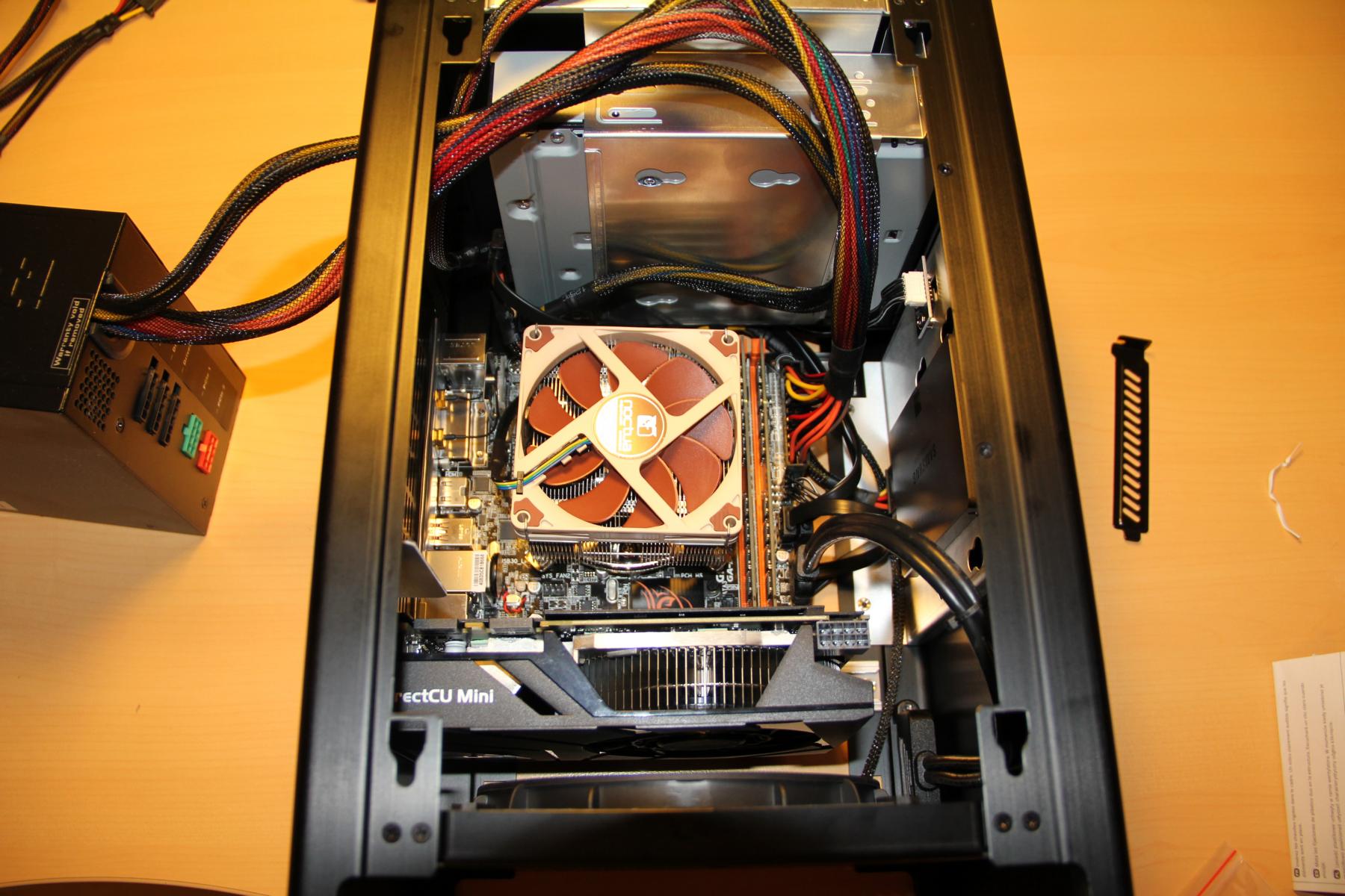 Kühler die Erste: Zuerst hatte ich einen Noctua NH-L9x65. Sicher ein sehr guter Kühler. Saugend montiert machte er heulende Geräusche, da er hierbei offenbar leicht an den Kühllamellen schleift.