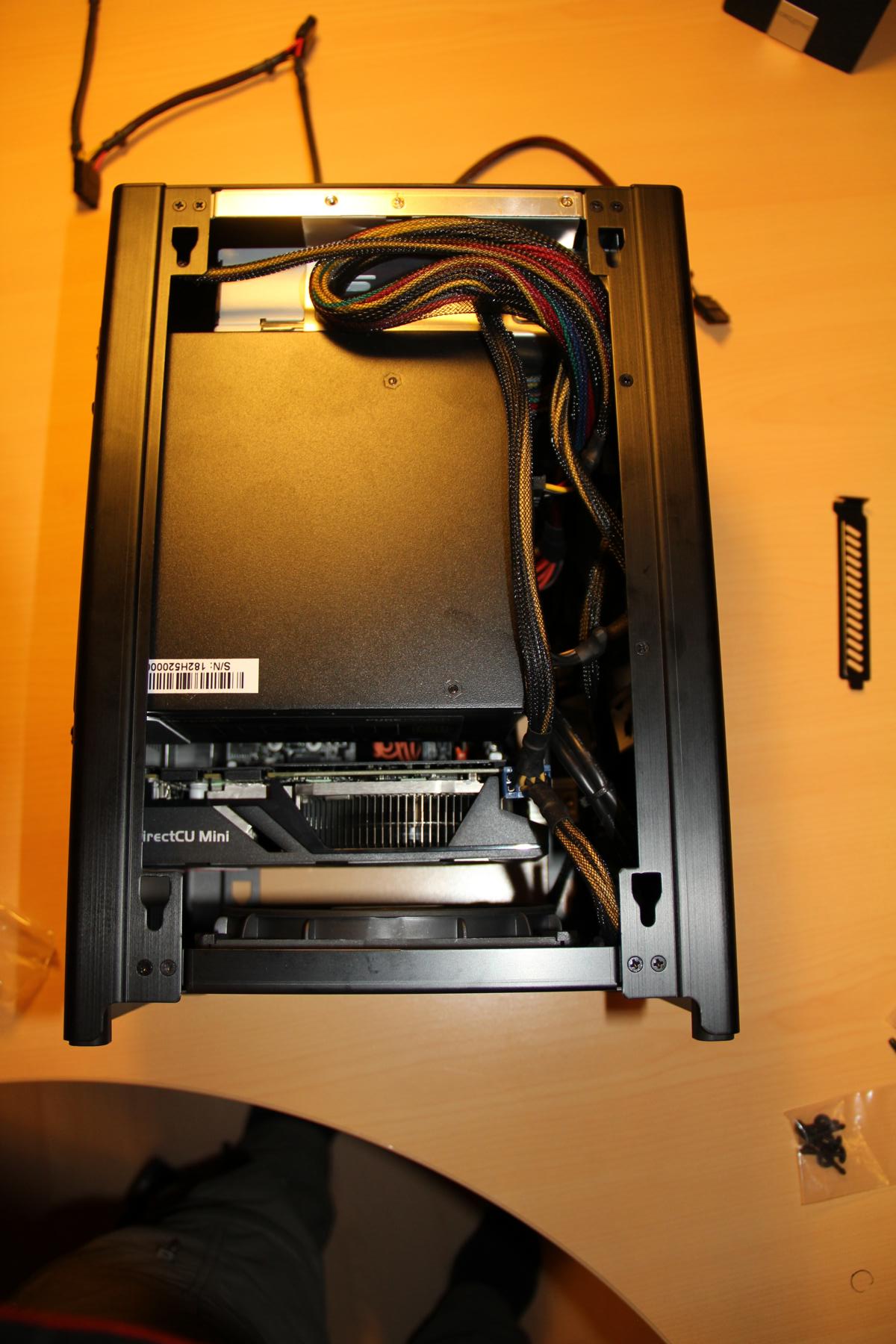 Da ich nicht zum ersten Mal einen ITX-Cube zusammenbaue wusste ich auf was ich mich einließ. Jeder Zahnarzt hat mehr Platz zum Arbeiten! Es ist bisweilen wirklich zum verzweifeln. Und es macht immer wieder Sinn sich Gedanken über die Reihenfolge zu machen. Ein Lüfter, der bei ausgebautem Board innerhalb 5 Sekunden auf den Kühler geklemmt ist, kann einen bei eingebauten Board und Kühler locker 5min zur Verzweiflung bringen. Und da man alle Kabel ja am liebsten "weg" haben möchte um den Luftaustausch nicht zu behindern, ist man um jedes einzelne Kabel besonders bemüht. Aber die Mühe lohnt!