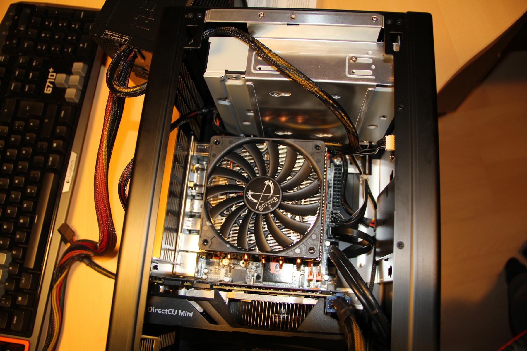 So leise wie möglich war oberste Priorität. Das war auch ein Grund warum ich mich für die o.g. Grafikkarte entschieden habe. Die Grafikkarte ist idle effektiv nicht hörbar! Man muss schon bei offenem Gehäuse mit dem Ohr an die Karte gehen um das Surren des Motors wahrnehmen zu können. Unglaublich was ASUS hier mal wieder auf die Beine gestellt hat. Auch unter Last geht das Geräusch des Lüfter im dezenten Rauschen aller Lüfter unter. Über die Leistung einer GTX970 OC brauche ich hier vermutlich nichts zu schreiben