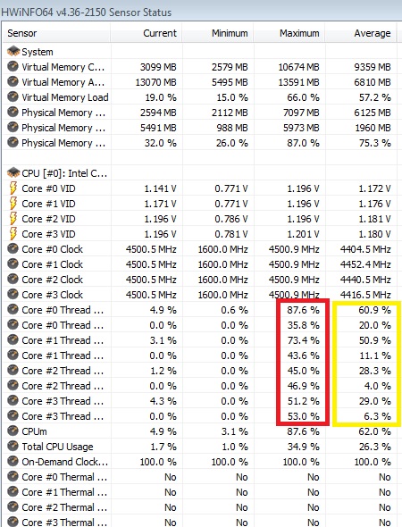 Ich habe die CPU Performance im Auge gehabt und poste euch mal nen HWInfo 64 Screen. Da sieht man die asymmetrische Auslastung ganz gut. Core 1 mit gut 60% average und Core 2 mit guten 50% average sind so gut wie für alles verantwortlich, die restlichen Cores trödeln mit und HT tut so gut wie gar nix.