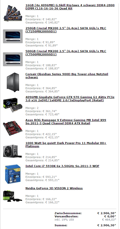 Wenn ich einen Blick in deine Signatur werfe, dann ist doch ein größeres Update absolut legitim. Man darf sich auch mal etwas gönnen. Hab viel Spaß damit und genieße jeden Augenblick! Ah, ein ASUS-ROG-Board ist auch mit dabei. Ich liebe diese Teile und hab bei meiner Zockermaschine das Rampage IV Black Edition verbaut. Richtig tolles Board, dessen einzige Schwäche der X79-Chipsatz darstellt.
