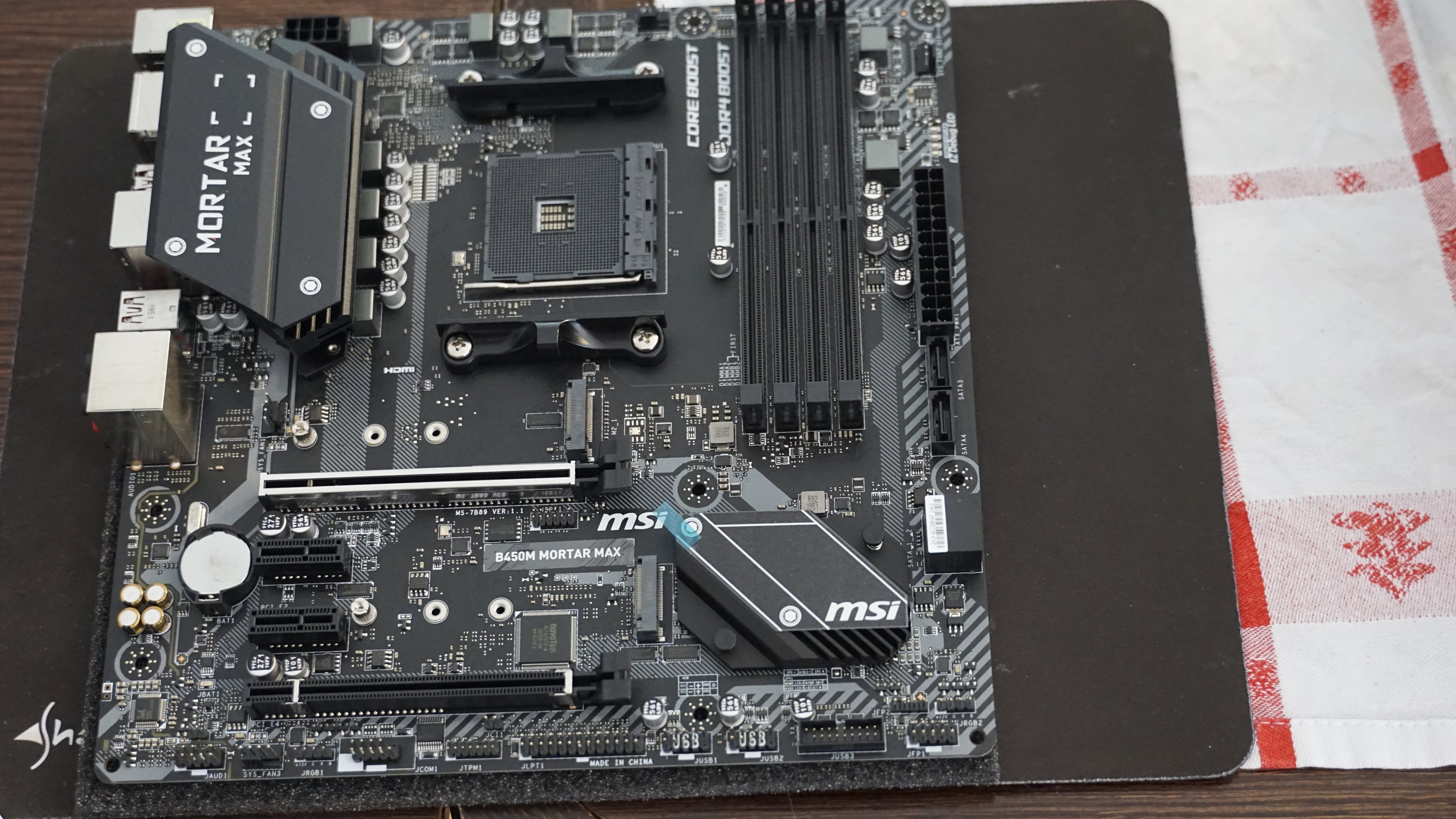 Bild 19: Nun zum Aufbau des Motherboards. Dazu dieses erstmal auf eine rutschfeste, weiche Unterlage gelegt. Besser wäre natürlich eine antistatische Matte.