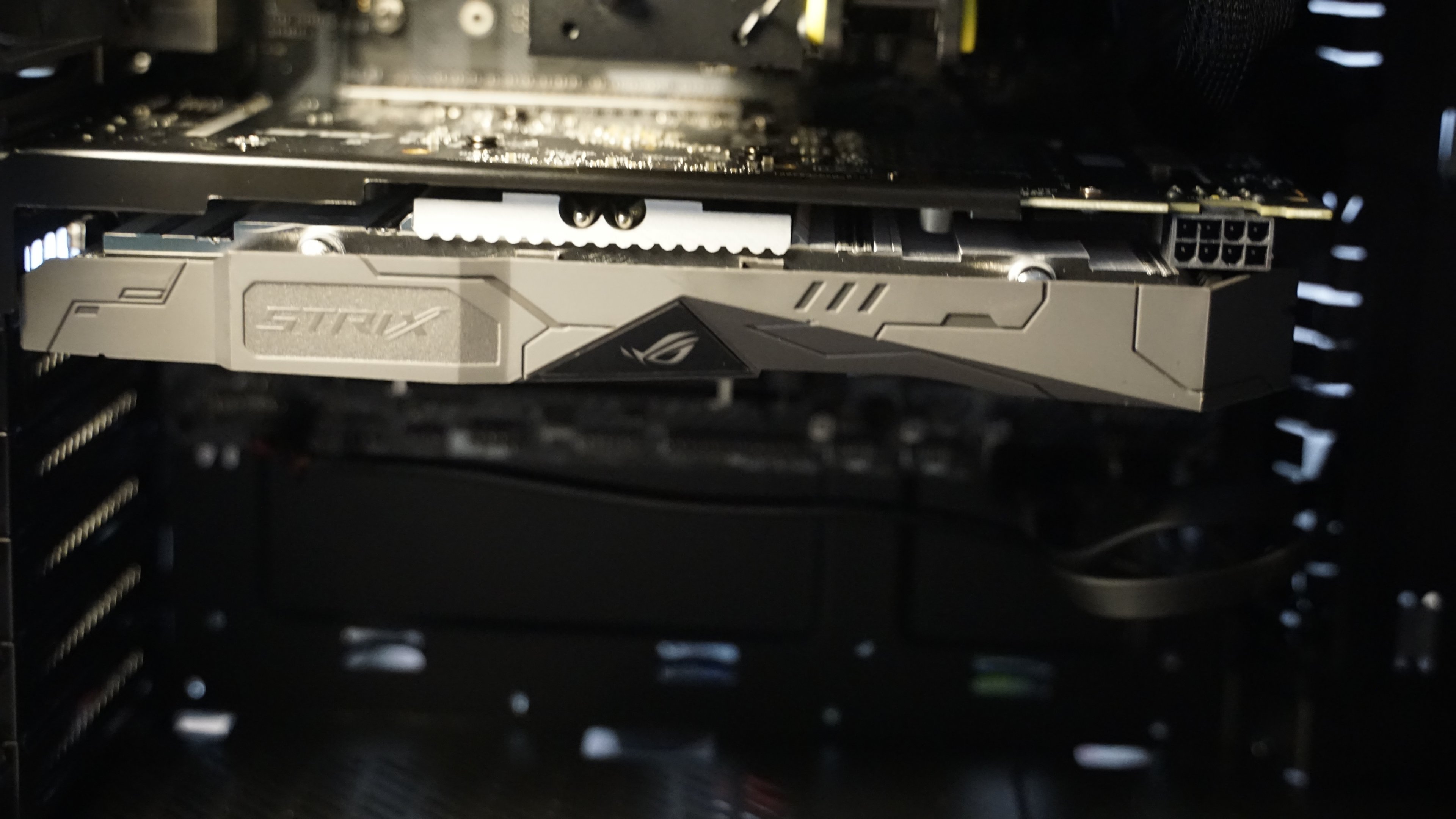 Bild 43: Jetzt noch schnell die Grafikkarte rein geschoben und mit dem Motherboard verbinden. Achtung auf diesem Bild fehlt noch die Verbindung der Grafikkarte mit dem Netzteil (Kleiner Stecker rechts oben an der Grafikkarte). Das sollte man natürlich nicht vergessen.