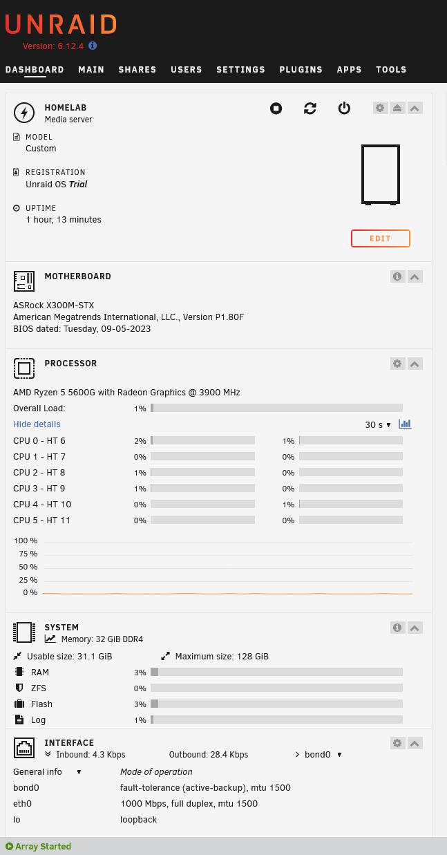 Mal schauen was ich bei Unraid noch in Erfahrung bringen kann bzgl. weitere Energiesparoptionen, das sind meine ersten Schritte mit dem OS. Mittels „powertop“ konnte ich zwar noch einige Einstellungen mutmaßlich optimieren, das ergab aber keine sichtbaren Änderungen am Energiemessgerät. Eventuell werfe ich auch nochmal einen Blick auf "TrueNAS Scale" oder ganz andere Optionen. Jetzt fängt die hauptsächliche Spielerei erst richtig an... :^)
