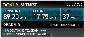 Zuerst habe ich mich dazu entschlossen, einen Downloadtest über speedtest.net durchzuführen. Da ich meine Hardware schon einen Tag vor dem eigentlich Anschalttag aufgebaut hatte, war ich bei dem ersten Testdurchlauf eher enttäuscht. Es fand nämlich kein schneller Download statt. Ein Neustart des Router hatte dieses Problem allerdings behoben. Ergebnis war soweit erst einmal ok.