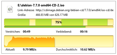 Was mir bei dem Test dann ein wenig negativ auffiel, war der viel höhere Ping im Vergleich zu meiner alten Leitung (ca. 10 ms mehr). Da man aber bei solchen Seiten nicht unbedingt die maximalen Leistungswerte ausreizt, habe ich noch ein paar weitere Tests gewagt. Der nächste Test war der Download einer Linux-ISO von debian.og.