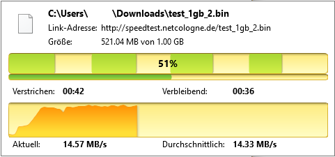 Getestet habe ich meine Downloadgeschwindigkeit mit einem Testdownload bei Netcologne: