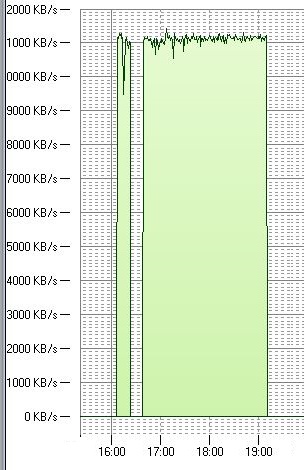 Ich habe noch einen weiteren Test gemacht, indem ich über einen gewissen Zeitraum die Leitung ausgelastet habe. Ich habe aus dem Usenet eine große Menge an Daten heruntergeladen - glücklicherweise liefert Alt.Binz einen Speedgraphen. Hier das Ergebnis: