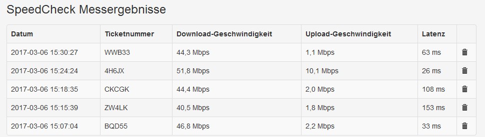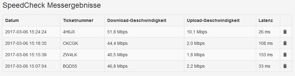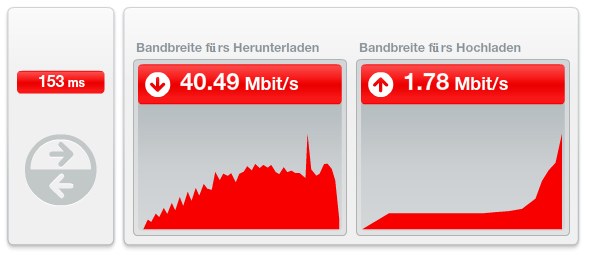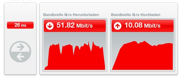 Der Downstream ist klasse und unheimlich stabil. Er schwankt zwischen den angezeigten 47 Mbit und 51 Mbit.