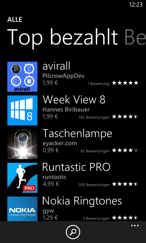 Das zweite große Thema ist der App Store. Man liest viel Kritik über den WP Store. Das kann ich wirklich nicht nachvollziehen. Ich fand den Store von Apple gut, Kritik kann ich hier keine anbringen. Und das gilt auch für den Windows Phone Store. Es gibt 4 grob Bereiche (3 wenn ein nicht Nokia Handy verwendet wird): Nokia Collection, Anwendungen, Spiele und Musik. In der Abteilung Nokia Collection finden sich sämtliche Nokia Apps, die speziell für die Nokia WPs programmiert wurden. Unter Anwendungen findet man allgemein alle Apps welche nicht als Spiel einzuordnen sind. Unter Anwendungen gibts wieder kategorien: top kostenlos, top bezahlt, neu + angesagt, beste kritiken, für sie empfohlen und Sammlungen. Unter Spiele gibt es die selben Kategorien wie schon bei den Anwendungen. Und bei der musik gibts genauso gut Kategorien. Das wichtigste finde ich allerdings die Suchfunktion, welche durch den kompletten store sucht. dh er findet spiele/apps/nokia apps und Musik. und das klappt auch, er hat bisher immer alles gefunden. Man kann natürlich auch speziell unter Anwendungen suchen, mache ich aber nicht, ich find mein zeug auch ohne dem. Insgesamt kann ich hier keiner der beiden Plattformen den Vorzug geben. Beider Stores erfüllen Ihren Zweck, und haben keine Fehler.