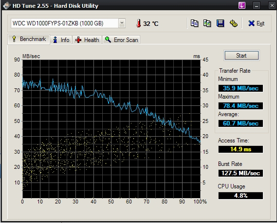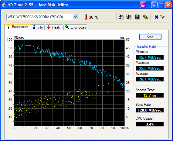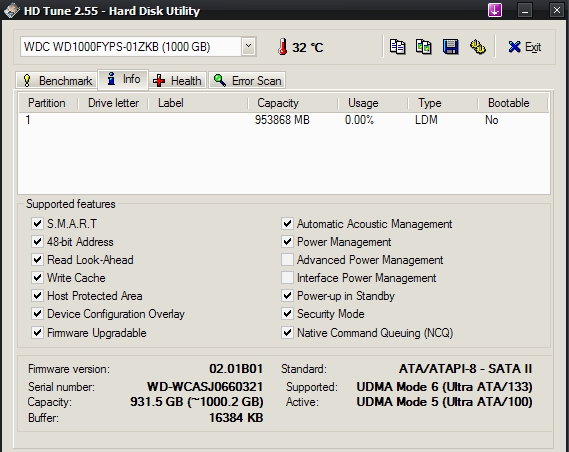 Die Festplatte brauchte bei mir keine Geschwindkeitsrekorde aufstellen, da sie eh nur zum Daten speichern herhalten muss, fürs System, Games etc wird weiterhin die WD500AAKS benutzt. Deshalb war es mir ganz recht, dass die Platte auch nicht mit 7200u/m daher kommt, sondern mit weniger (laut diversen Angaben variabel zwischen 5400upm und 7200upm, kann aber niemand genau bestätigen).