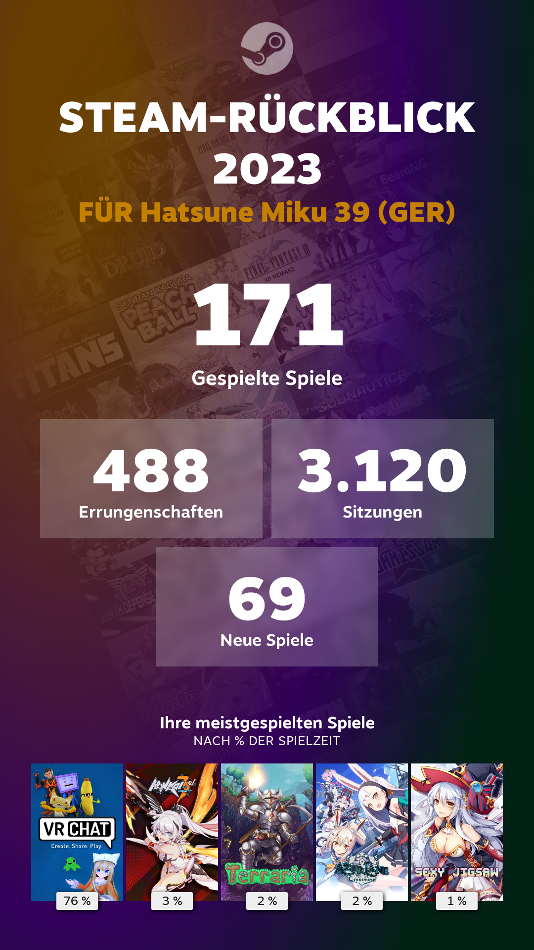 Bei mir ist es wie auch in den letzten Jahren, VRC dominiert und sonst ist der spielemarkt ja eh nicht mehr wirklich brauchbar.