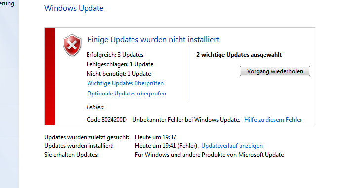 Die Meldung lautet immer "unbekannter Fehler bei Windows Update" und Code 8024200D.