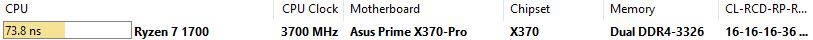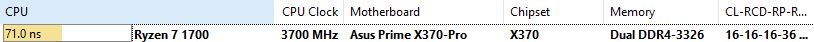 Aufgefallen ist mir dieses Phänomen, weil ich bei meinem RyzenOC grundsätzlich alle Nebenprogramme geschlossen habe (Antivirus, Steam, Afterburner, etc) und dabei auch einige Benchmarks gemacht habe und dabei die Speicherlatenz stets bei etwa 71ns geliegen ist. Nachdem ich dann das OC vollständig validiert und alle Programme wie immer konfiguriert habe, war die Latenz stets bei etwa 74ns, egal wie oft ich den Benchmark auch ausführe.