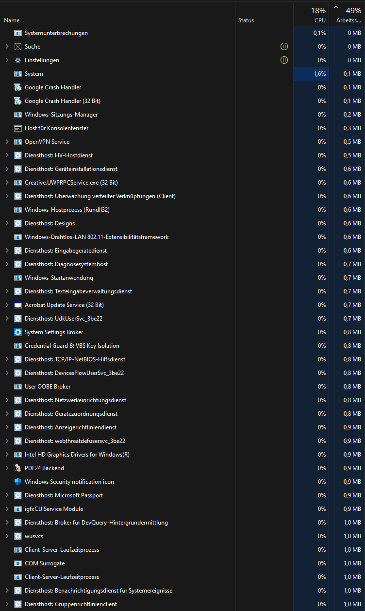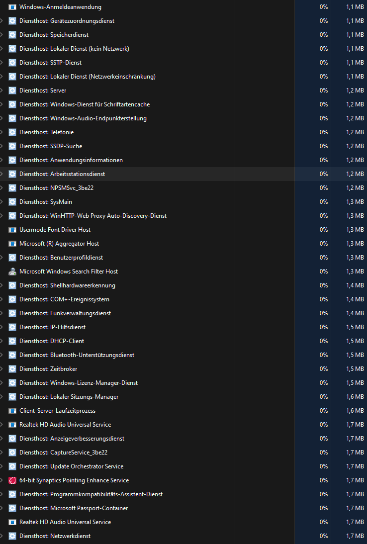 Der Arbeitsspeicher ist im Ruhemodus meistens schon bei über 50% und im Hintergrund laufen diverse Programme, deren Nutzen mir sich nicht erschließt. Dafür hab ich zwei Screenshots angefügt und vielleicht kann mir jemand erklären, für was insbesondere "Diensthost" steht, da diese zuhauf auftreten, und ob die 50% Arbeitsspeicher ein berechtigter Wert sind.