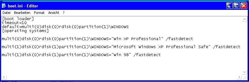 Bootmenü hab ich mit der boot.ini hinbekommen. Allerdings findet er das Windows auf den neuen Platten nicht.