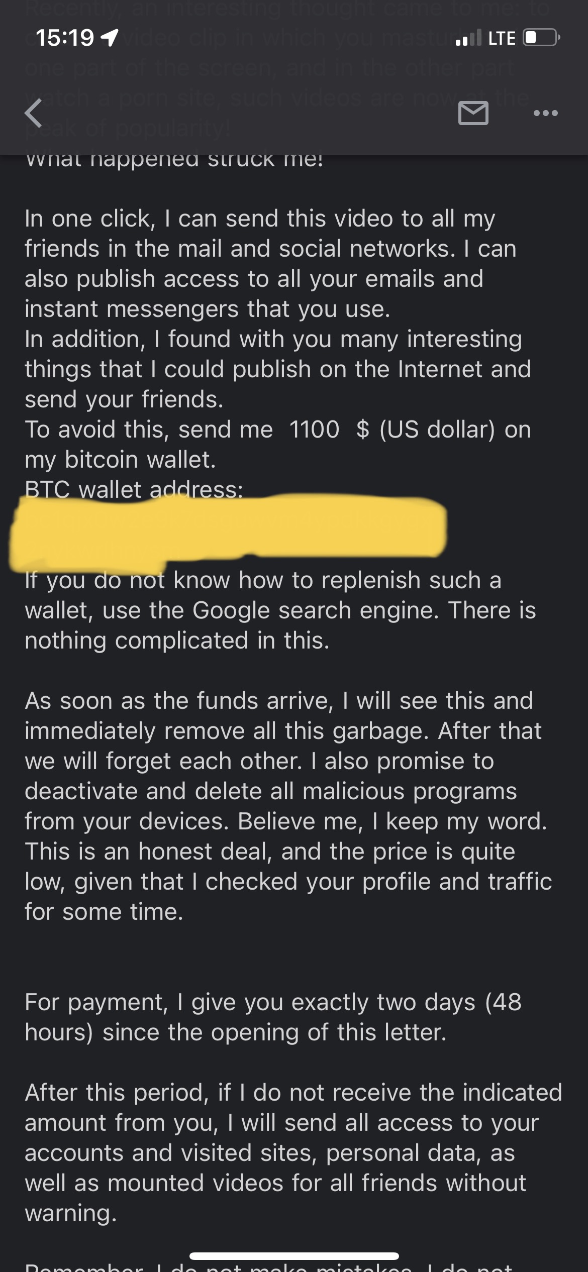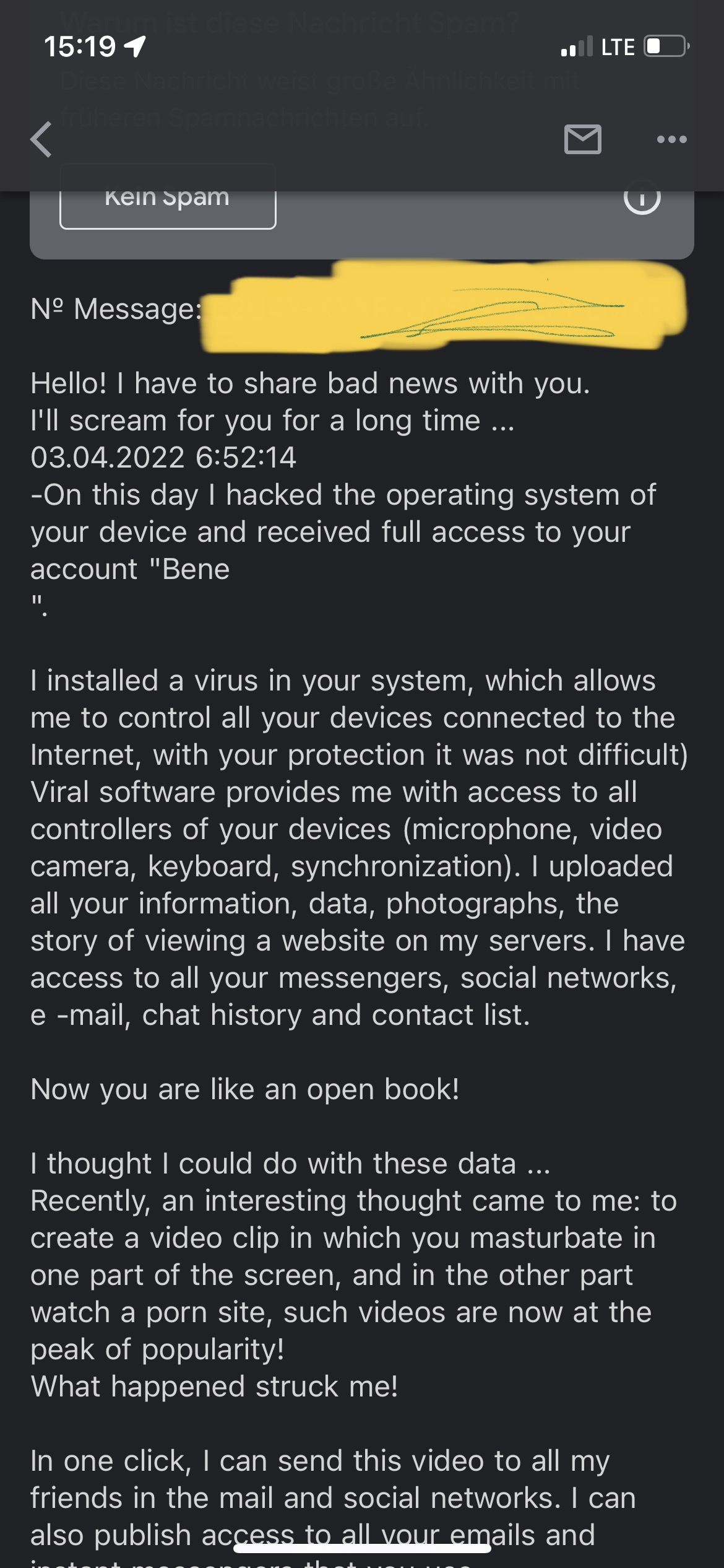 Ich bekam heute eine Mail, welche mich darauf hingewiesen hat, dass man meinen PC im April gehackt hat. Was auch stimmt, da ich da komische logins etc. auf Google etc. hatte. Habe direkt am ersten Tag ein neues Handy gekauft und auch die Festplatte kommentarlos ausgebaut und eine neue eingebaut.