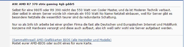 Was das 530 Watt Kommentar betrifft wurde ich aber besseres belehrt habe das Cool Master G550M also 20 Watt mehr und laut einigen Leuten hier kann man ohne Probleme noch die 980ti oder auch Die R390x mit befeuern auch unter Last. Weil es immer darauf ankommt wie die Spannungen verteilt sind auf den schienen bzw in dem Fall auf der 12V Schiene verteilt sind. Wenn ich etwas falsch verstanden habe in dem Zusammenhang dann entschuldige.