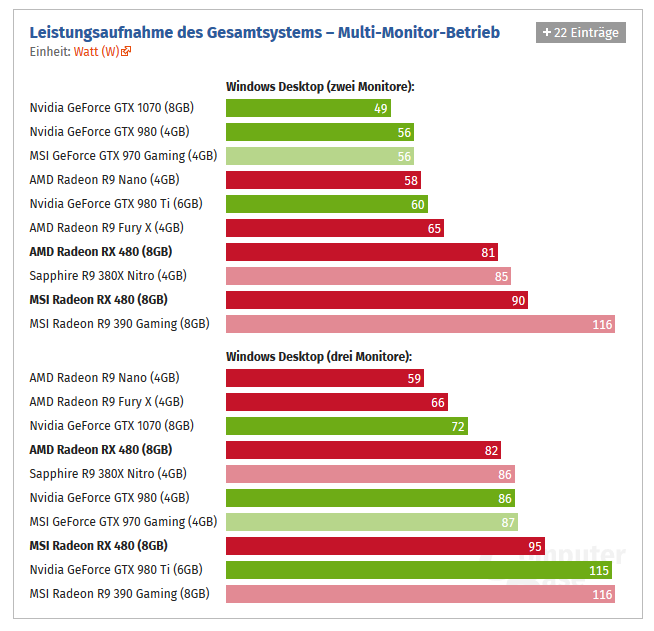 - möglichst stromsparend im 2D-Modus, auch in meinem Setup mit zwei Monitoren