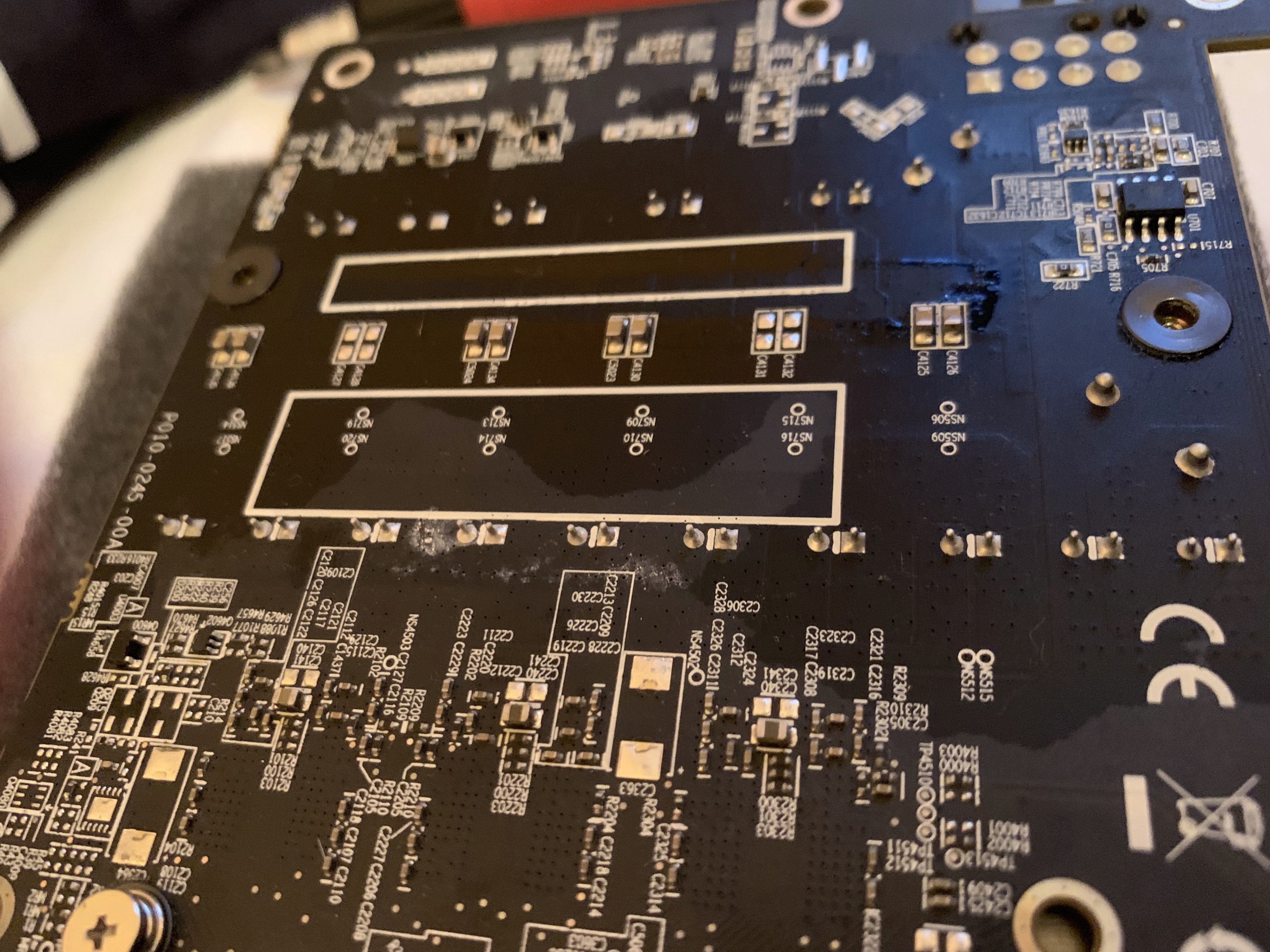 Was mir auf der Karte aufgefallen ist, das auf der Platine leichte Flecken sind, die wie getrocknete Flüssigkeit aussieht.