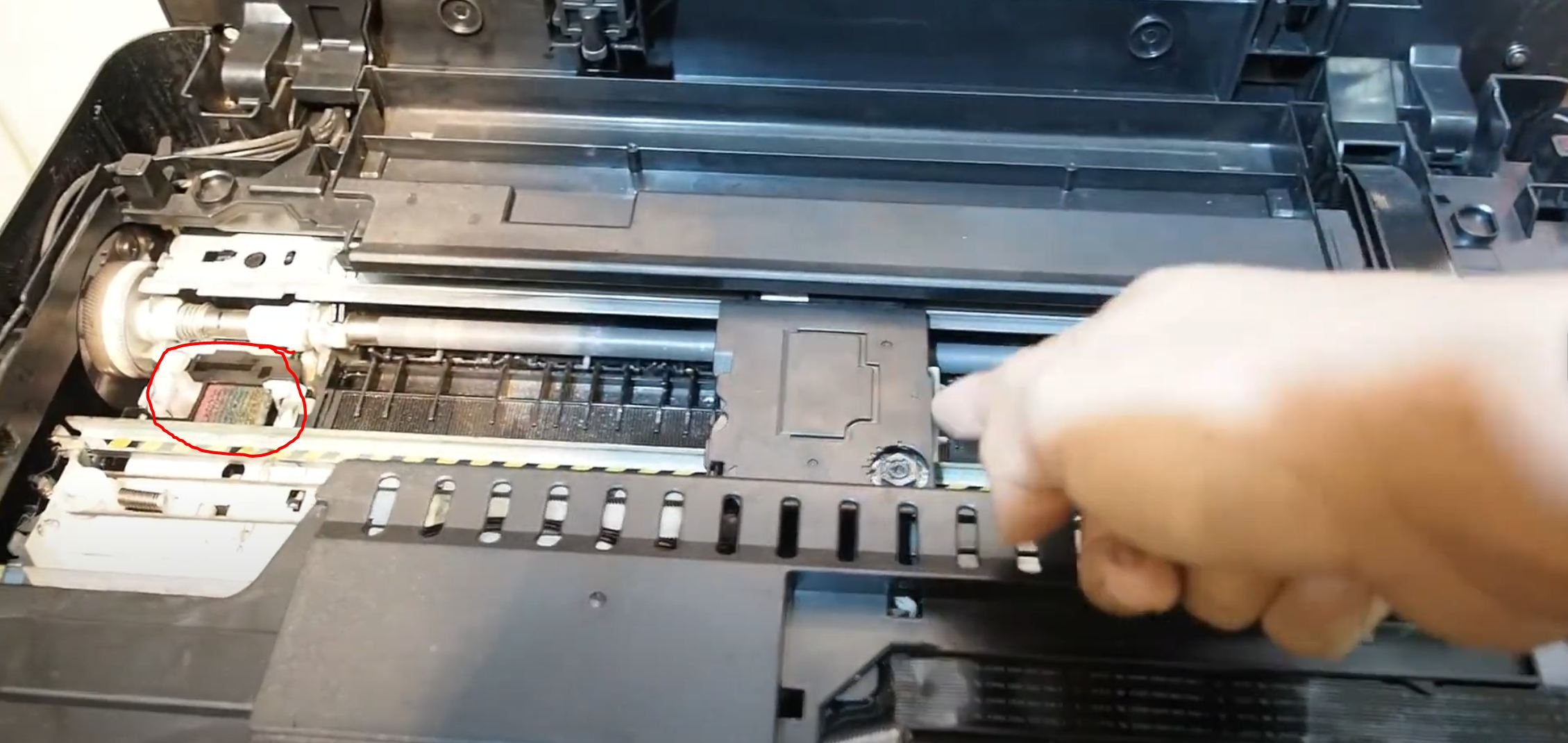 Der Schwamm ist da, wo der Drucker die Farbe drüber abwischt auf der ganz linken Seite.