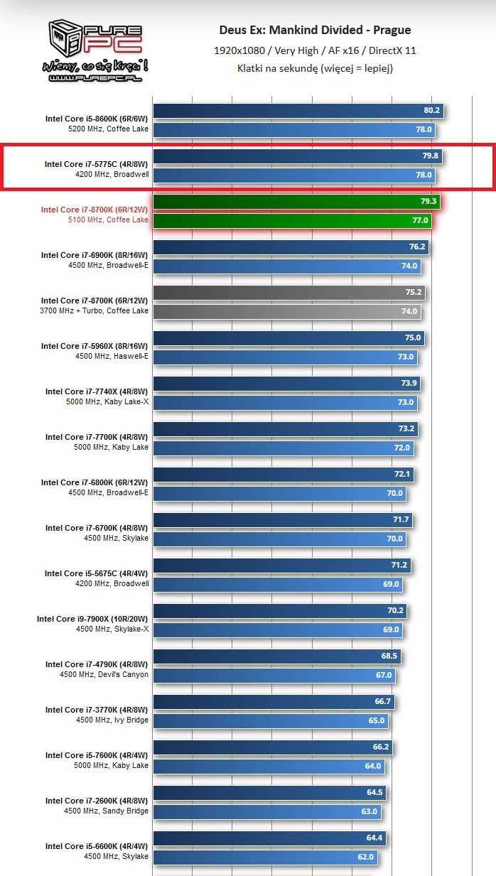 Und kann immer noch sehr gut selbst eine RTX2080 Ti auslasten, obwohl alle 8 Threads nahezu @ 100% werkeln, dank 128 MB eDRAM.