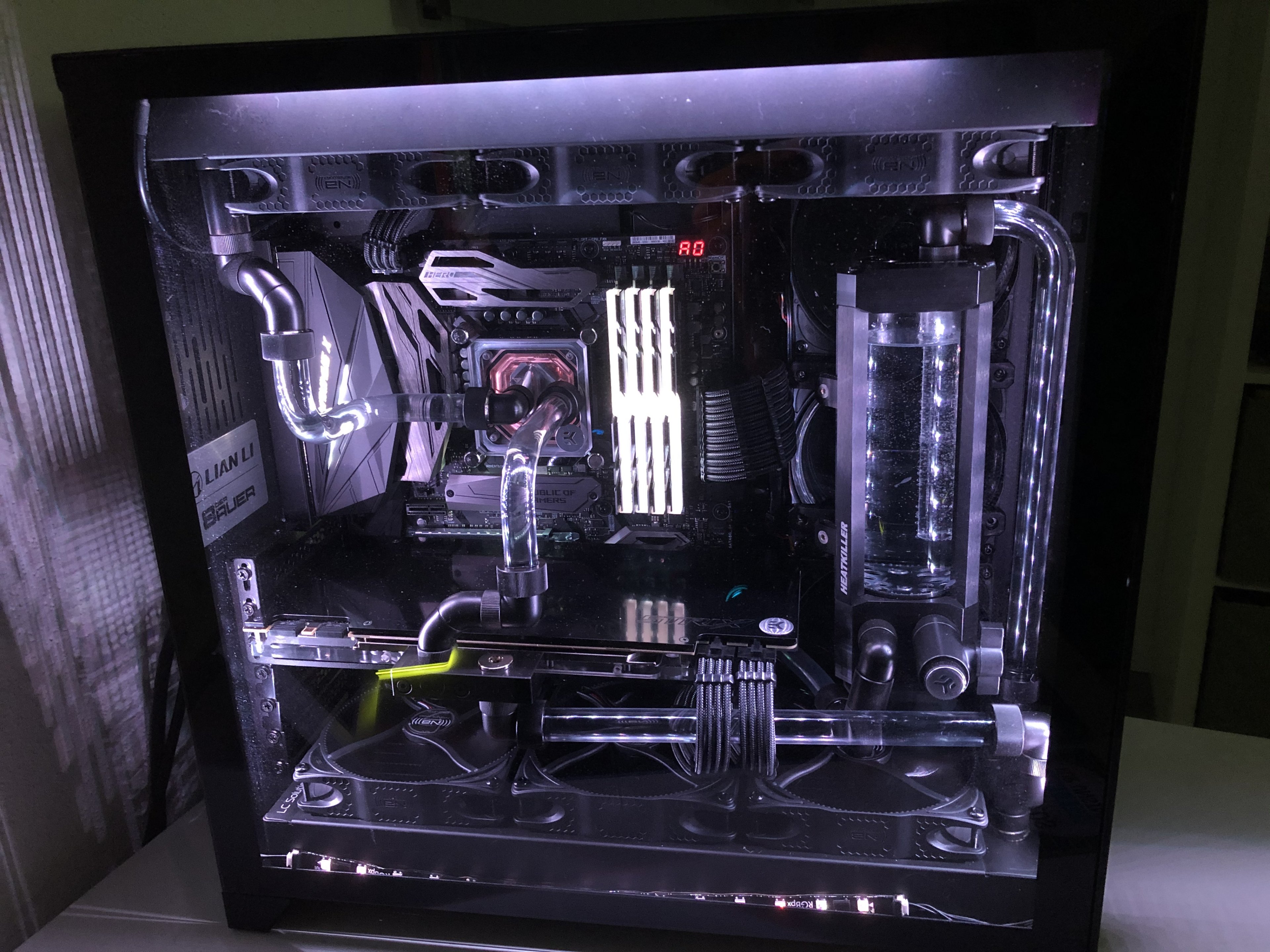 Es war zwar eine große Herausforderung das ganze Zeug in das Lian Li O11D zu bekommen, habe es aber am Ende geschafft und es funktioniert wunderbar. Temperaturen in allen Bereichen nun deutlich besser und auch deutlich leiser. Die DDC 3.1 Pumpe der Distro Plate war schon deutlich lauter, dazu kam das die EK Lüfter mit 1200rpm drehen mussten um überhaupt anständige Temperaturen hinzubekommen. Dabei waren die Lüfter dementsprechend laut. Nun laufen die Lüfter mit 650rpm und sind unhörbar. Die D5 ist fast lautlos bei 2800rpm und erzeugt einen Flow von 110l/h.