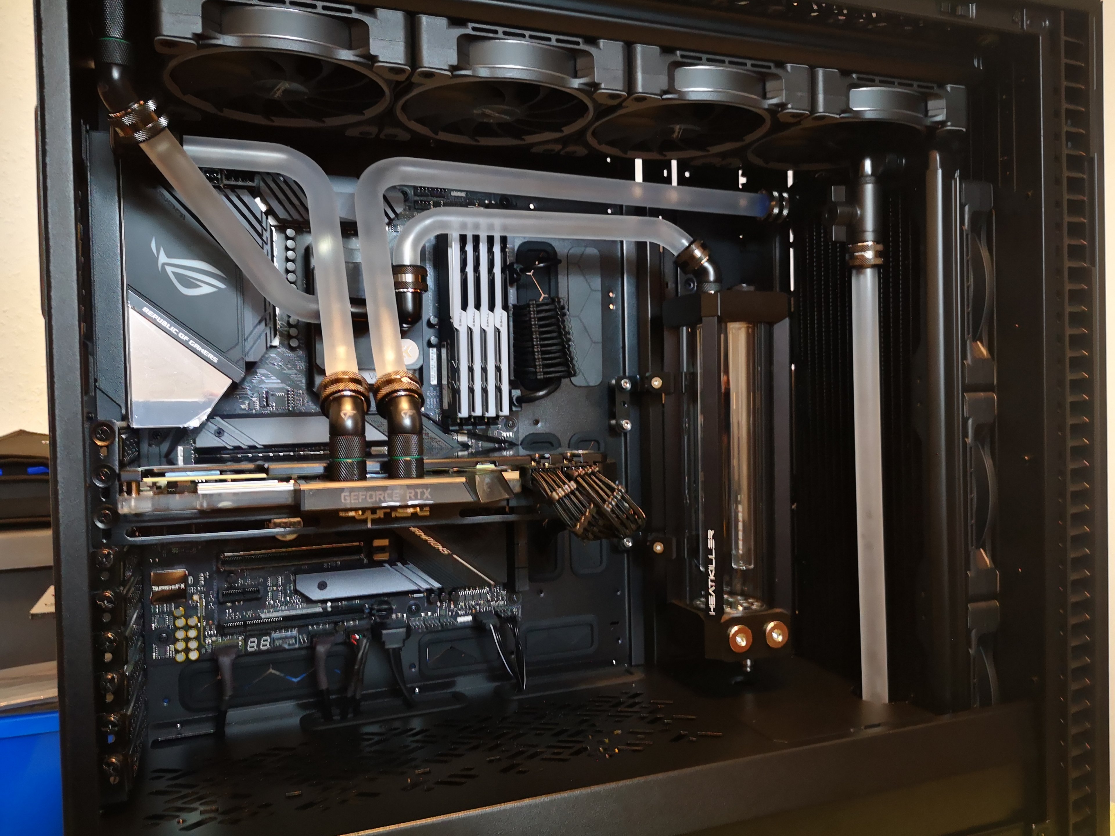 Mega. Wäre mir zu aufwendig aber gefällt mir sehr gut. Was hast du für Radiatoren verbaut? Ich habe oben die Lüfter über dem Radiator verbaut weil die Radiatoren selbst etwas breiter als 140 sind und damit oben leider nicht rein gehen. Ausser man baut da etwas mit einem Distanzrahmen oder ähnliches. Die Lüfter halten die Breite von 140 ja ein und gehen darum auch genau rein. Hätte sie auch lieber durch den Radiator nach aussen blasen lassen. So saugen sie die Luft nach oben weg.