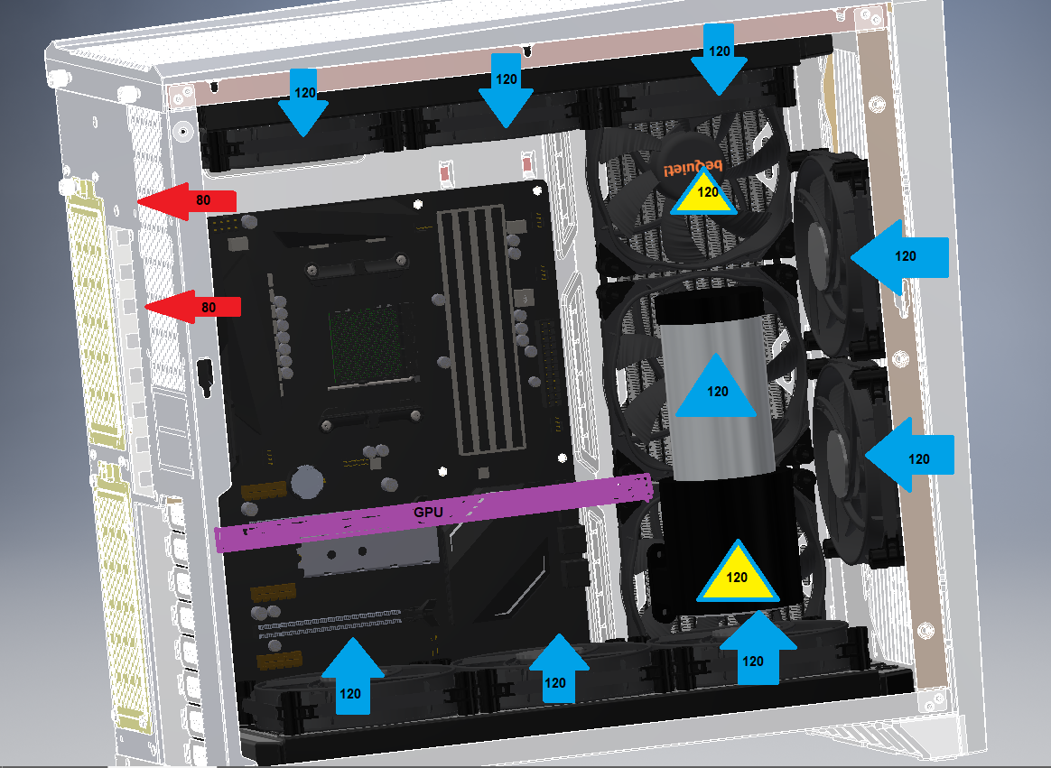 Macht aber nichts, denn wenn du die Lüfter geschickt wählst, dann hast du auf den Radiatoren welche, die eher hohen statischen Druck erzeugen und für die "freien" Lüfter halt welche die einen hohen Volumenstrom erreichen. Wenn dann noch Staubschutz an den Radiatorlüftern ist, dann werden 2 ausblasende Lüfter die Problematik weitestgehend entschärfen.