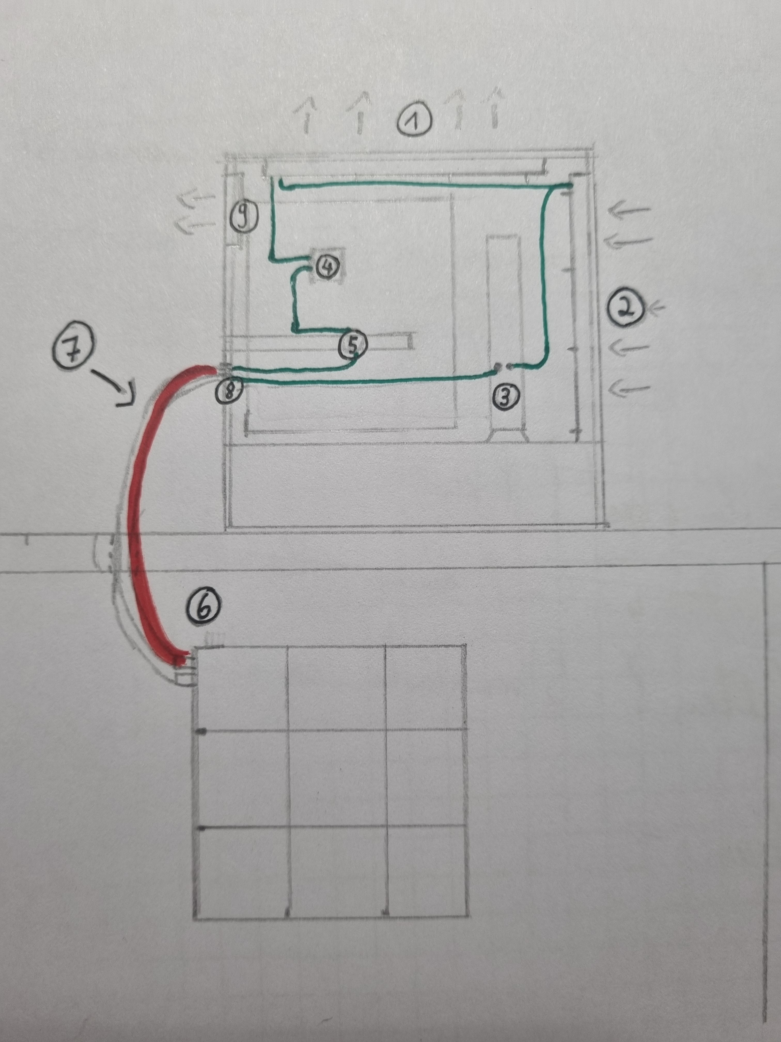 In der Skizze befindet sich das Gehäuse auf meinem Schreibtisch und der MO-RA darunter. Löcher für Kabel bzw. Schläuche wie in der Skizze sind bereits vorhanden. Hardtubes grün, softtubes rot. Grün ist nur exemplarisch
