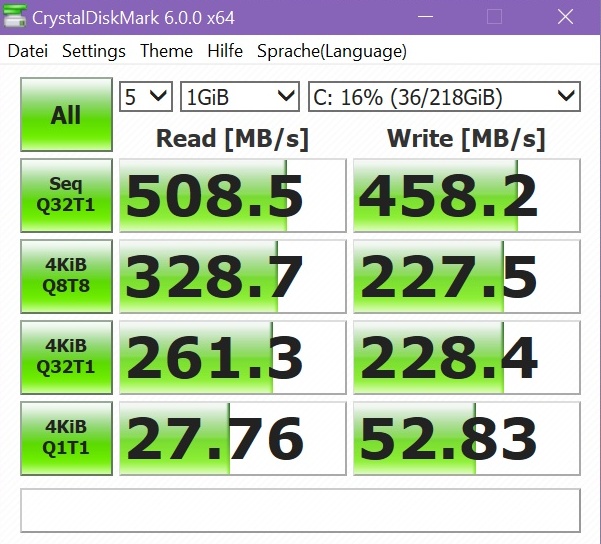 Bei CrystalDiskinfo steht bei "Übertragungsmodus": SATA/600 und bei "Schnittstelle" Serial ATA. Sollte das nicht PCIe sein? Okay, an der Stelle erkennt der Nerd das hier ein Noob schreibt