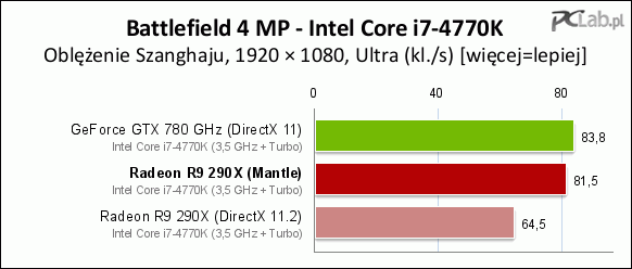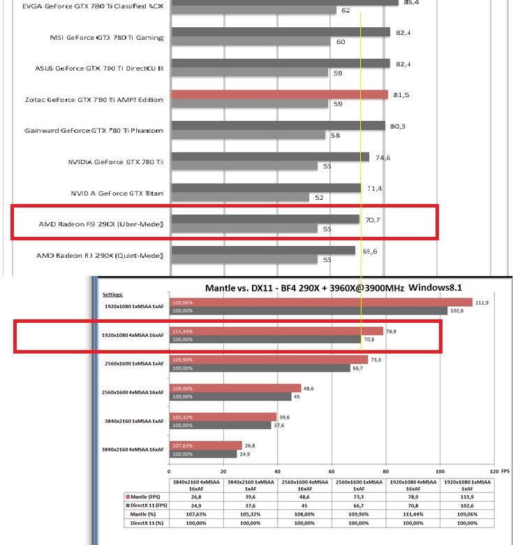 Zweitens hat er schon teilweise recht mit der Aussage, dass die nVidia Karten die Werte der AMD Karten MIT Mantle bereits erreichen unter Windows 8, siehe Post von Kartenlehrling. Vergleicht man die Performance-Zuwachse der nVidia Karten zwischen Windows 7 und Windows 8.1, so sind die zwar nicht ganz so extrem wie bei Mantle, aber doch vorhanden. Darum geht es. Wie im obigen Diagramm schön zu sehen ist, gewinnt die R9 290X im Uber Mode so um die 11% und liegt dann betreffend average FPS gleichauf mit der 780Ti resp. leicht darüber. Man kann jetzt also durchaus salopp schlussfolgern, dass AMD einfach schlechte DX Treiber fabriziert hat, da ja die Performance mit Mantle von nVidia auch ohne Mantle erreicht wird. Es ist grundsätzlich immer in beide Richtungen möglich: es kann sein, dass