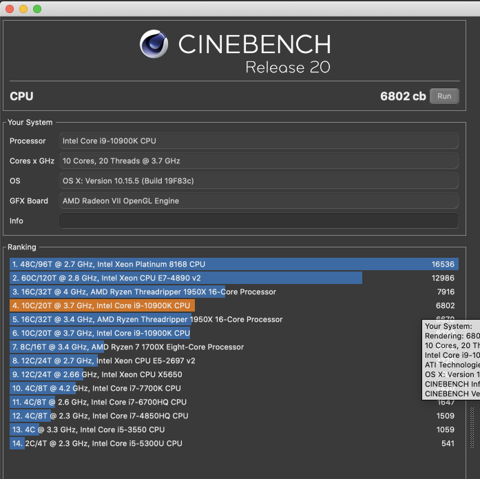 Allerdings grad unter MacOS 10.15.4 und während Citrix Receiver und Browser offen war. Aber mein Cinebench unter Windows ohne extra Programme war niedriger, 6649.