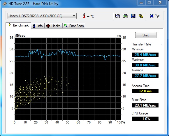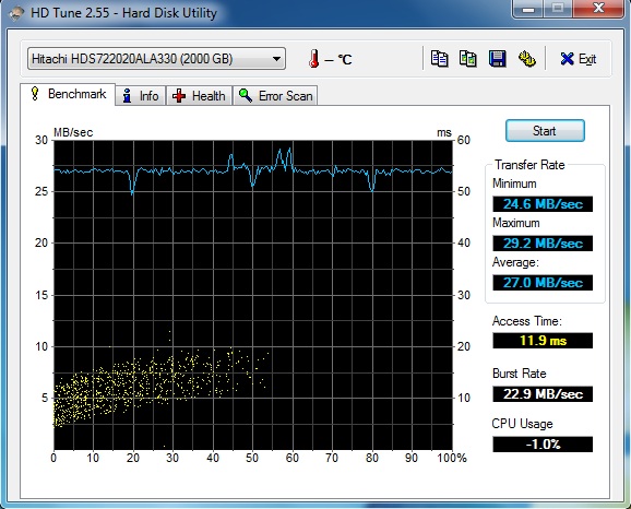 (blaue kurve)eins HDD-Test-tools(HD-Tune 2.55) ...nun viel mehr kalckt die platte im sek-tackt. Bei dem Access-Time check (gelbe punkte) macht die platte ebenfalls geräusche,die sich nach
