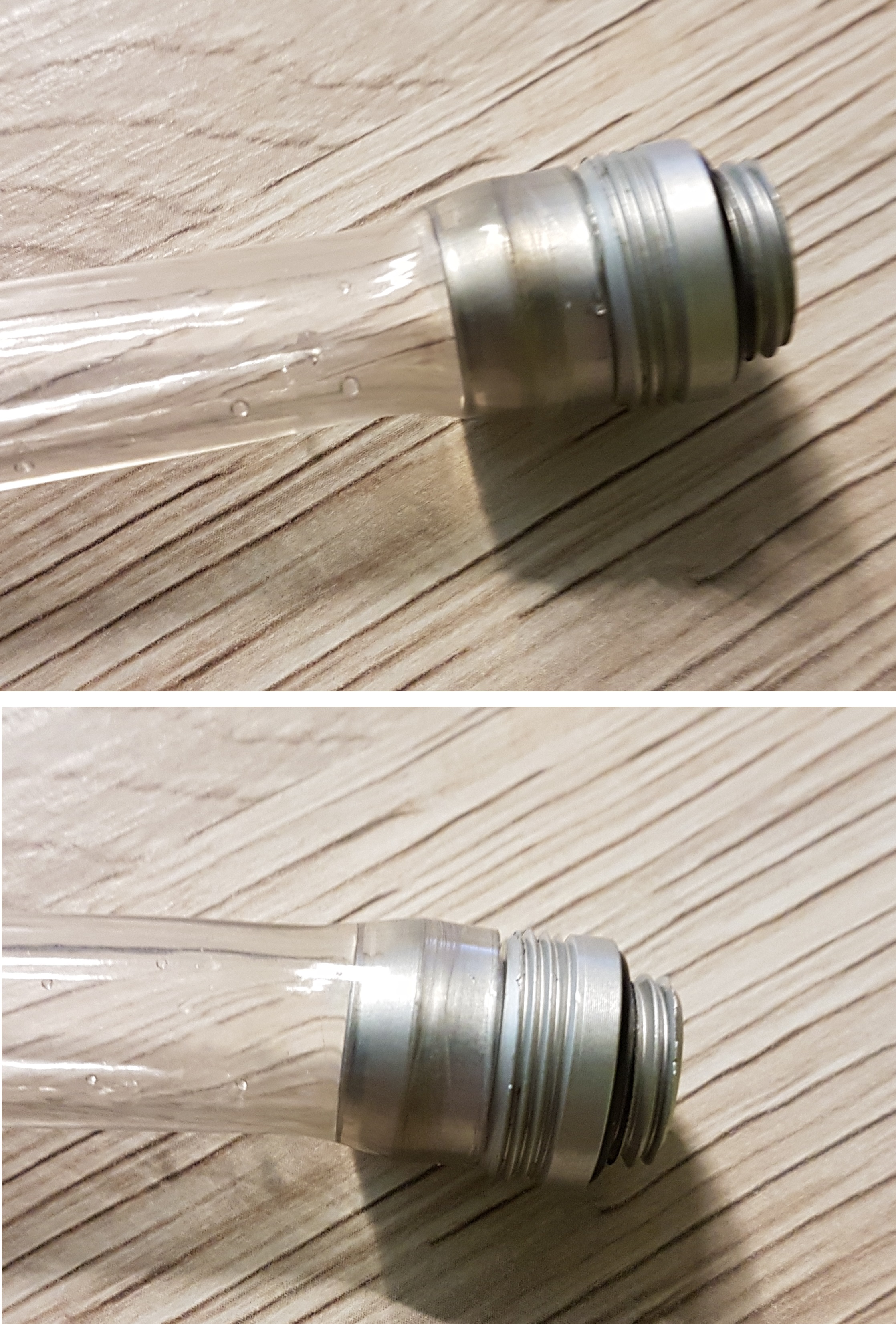Der Mayhems Schlauch geht etwas schwieriger auf den Fitting, dennoch flutscht es recht gut und sitzt dann auch bombenfest. Der Masterkleer lässt sich ohne Schraubring leicht abziehen, ist bei dem Mayhems nicht so.