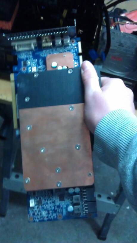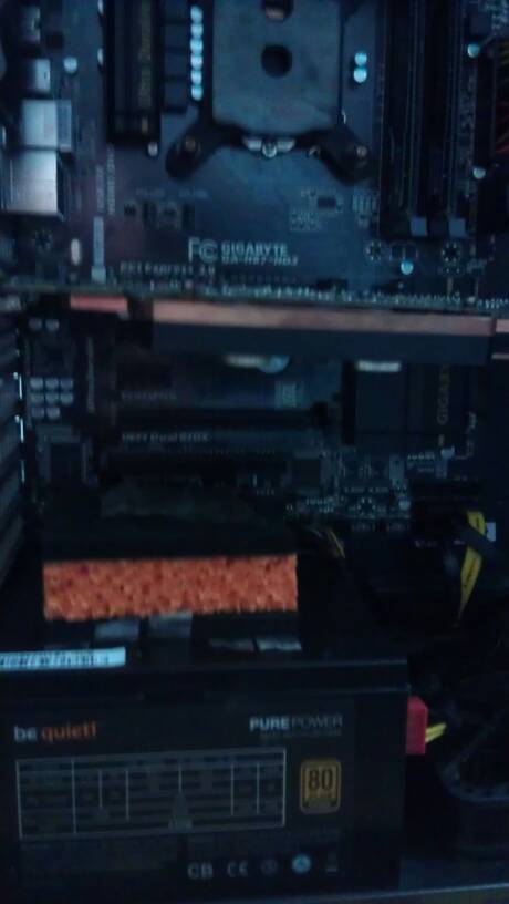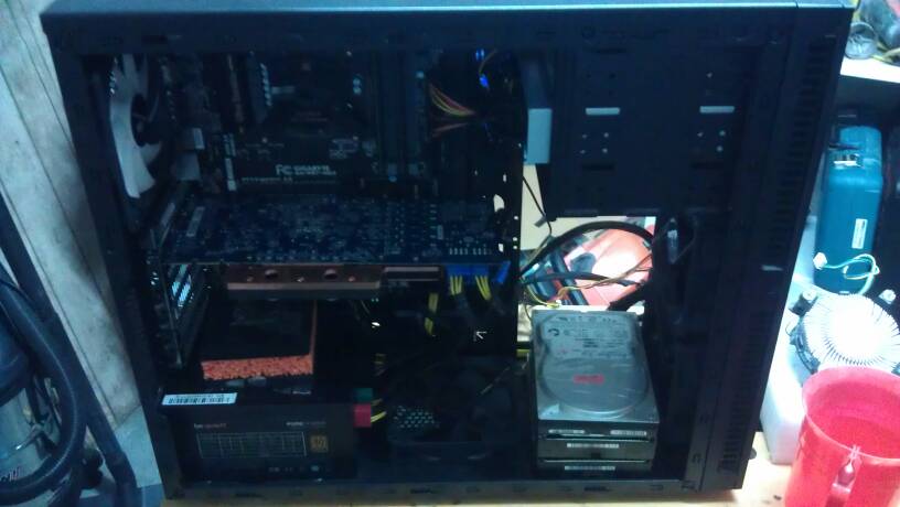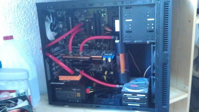 hier ein paar Bilder wie man sieht ist das Gehäuse seines Festplattenkäfigs beraubt wurden ( hat auf der Unterseite ein paar Blessuren hinterlassen) die noch 3 bald 2 oder 1 HDD's sind als Paket verschnürt auf dem Boden und mehr oder weniger entkoppelt. Die pumpe soll auf das PSU drauf wenn Sie mal da ist und der AGB kommt irgendwann mal woanders hin, das kann aber noch dauern. Mfg Ogie