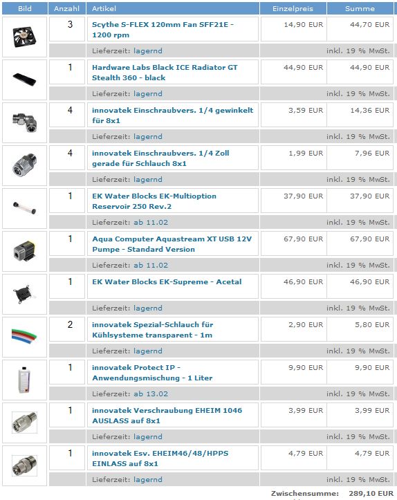 am ende des monats möchte ich mir meine erste WaKü zulegen (erstmap nur cpu). ich habe ein bischen in den WaKü FAQ rumgestöbert und habe mir letztendlich folgendes zusammengestellt